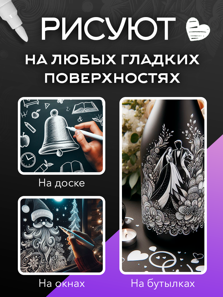 Универсальный белый меловой маркер - идеальный инструмент для создания новогодних украшений и рождественских надписей. Подходит для рисования на стекле, окне и других гладких поверхностях. Используйте его во время занятий в школе, чтобы писать на доске ярким, насыщенным белым цветом. Эти белые меловые линии легко стираются тряпкой.