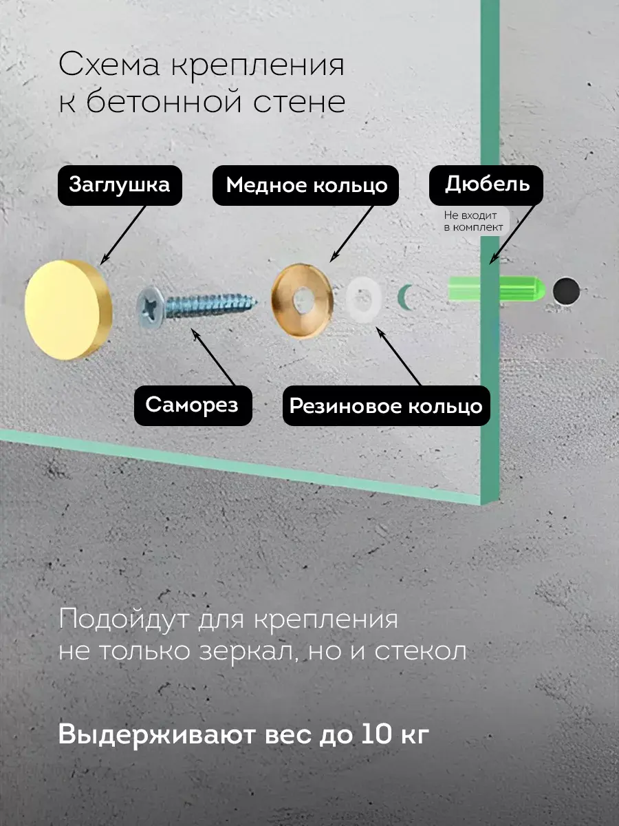 В комплекте 4 дистанционных крепления, без дюбелей. Благодаря простоте конструкции, вы сможете без труда выполнить монтаж самостоятельно. Подарите своему дому уют и стильное оформление с помощью дистанционных держателей для стекла, зеркала и табличек!