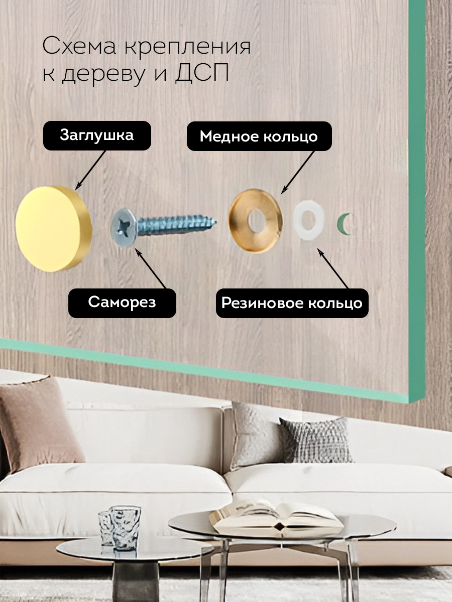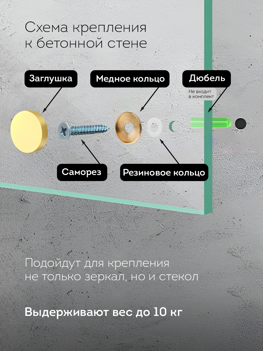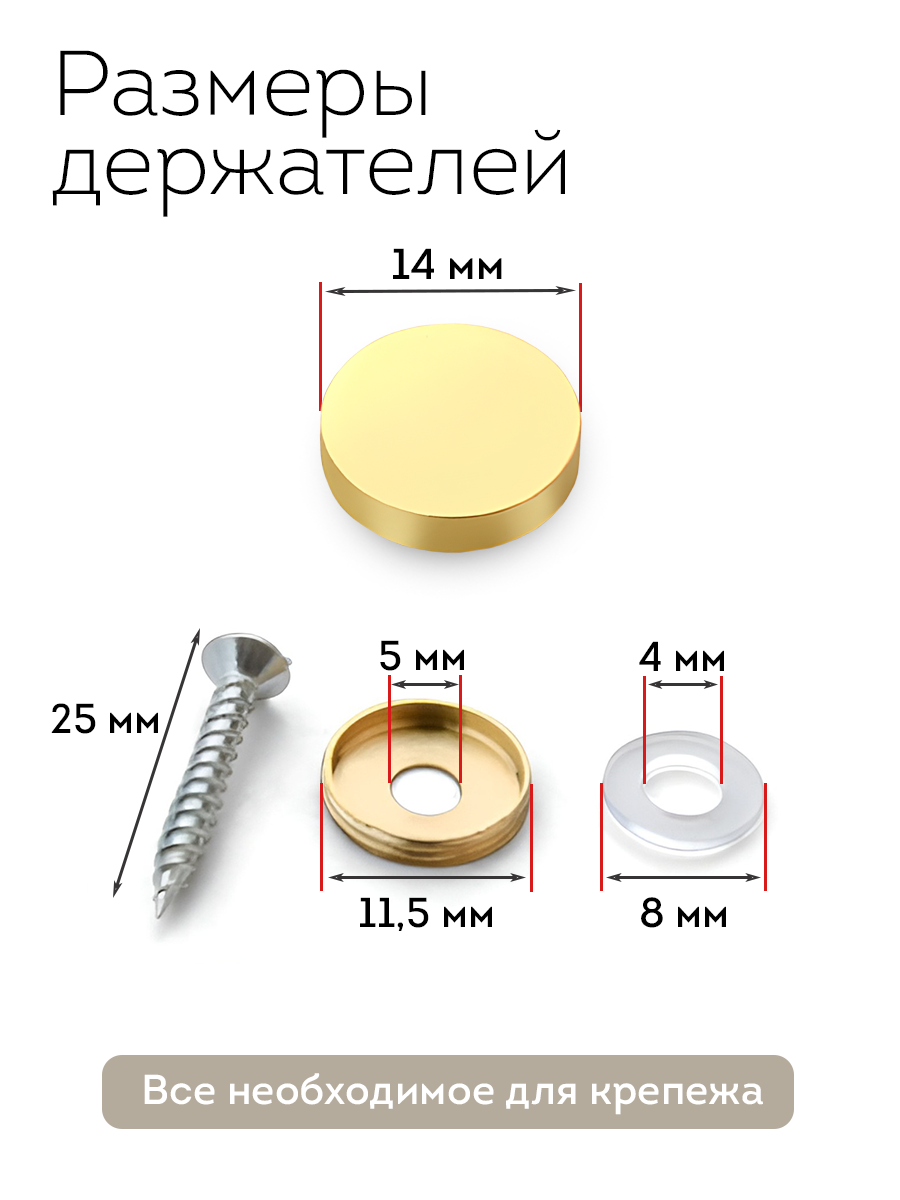 В комплекте вы получаете 4 держателя, каждый из которых имеет в наборе металлическую декоративную шляпку диаметром 1,4 см, пластиковую прокладку, саморез. Держатели сквозные, то есть для закрепления зеркального или стеклянного полотна вам необходимо сделать отверстия в нем. Это позволяет вам надежно закрепить зеркало или стекло на стене. Кроме того, сквозные держатели наилучшим образом подходят для крепления материалов в ниши.