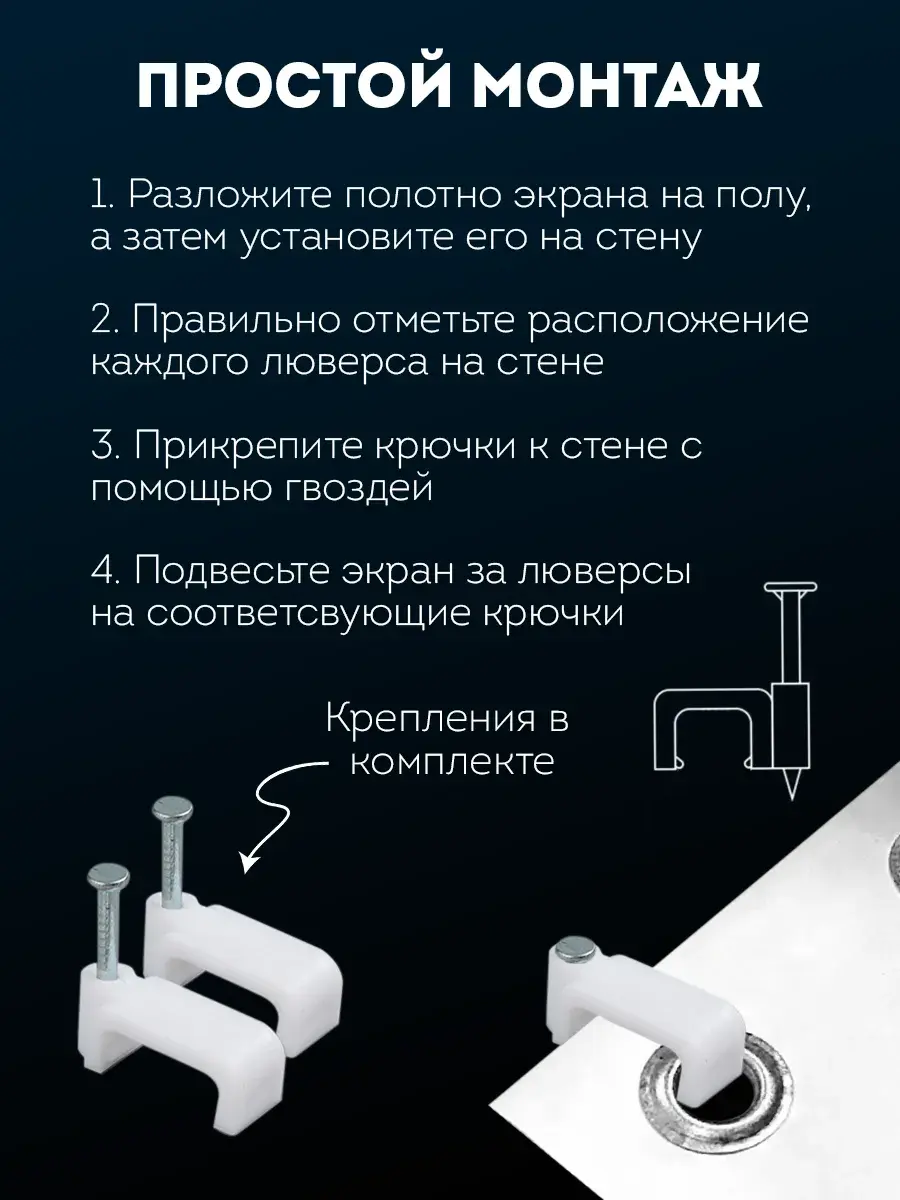 Экран поставляется в прочном транспортировочном картонном тубусе, что гарантирует его защиту во время транспортировки и хранения. В комплекте также предусмотрен крепеж, что делает установку экрана максимально простой и удобной. Для вашего удобства инструкция по установке представлена на слайдах в карточке товара.