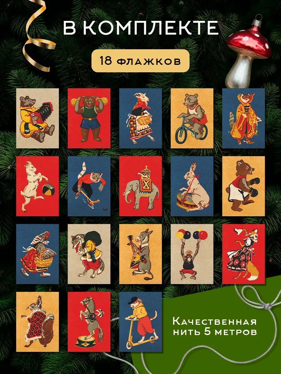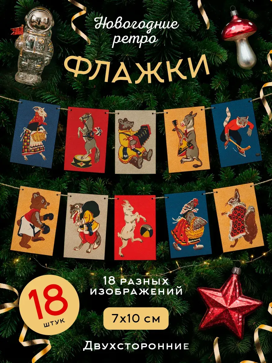Комплект флажков изготовлен из качественного материала и устойчив к воздействию внешних факторов, что позволяет использовать его многократно. Каждый флажок украшен красочными изображениями, характерными для периода советской истории, что делает их идеальными для тематических новогодних декораций.