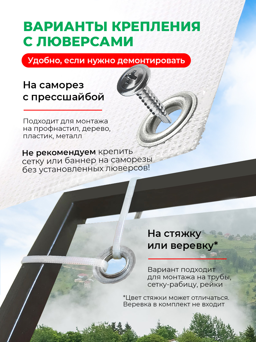 В комплекте к фотосетке идут в необходимом количестве люверсы, из расчета шага 40 см.