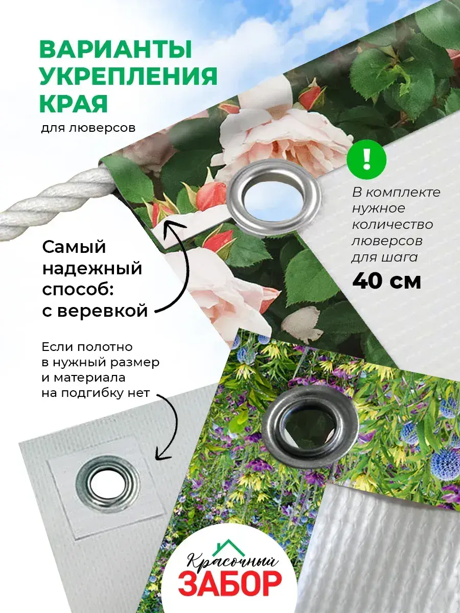 Важно! Люверсы на полотно не установлены. Предусмотрена самостоятельная установка люверсов на предварительно подготовленную сетку нужного размера. Подробная инструкция с иллюстрациями представлена на слайдах в карточке товара.
