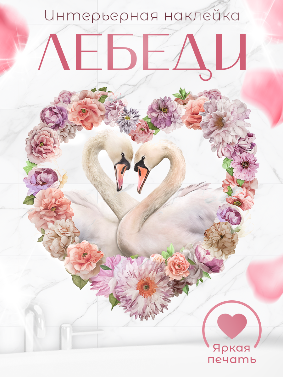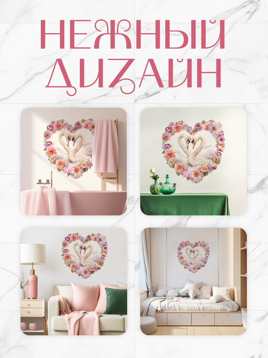 Интерьерная наклейка “Лебеди” - это прекрасный способ добавить нотку романтики и нежности в ваш дом. Она представляет собой изображение двух великолепных лебедей, которые символизируют любовь и верность в обрамлении цветочной рамки в виде сердца в розовых тонах. Наклейка изготовлена из качественных и безопасных материалов, поэтому она не только стильно смотрится на стене, но и легко наклеивается и снимается, не оставляя следов. С этой наклейкой ваш интерьер приобретет особую изюминку, станет уютным и неповторимым.