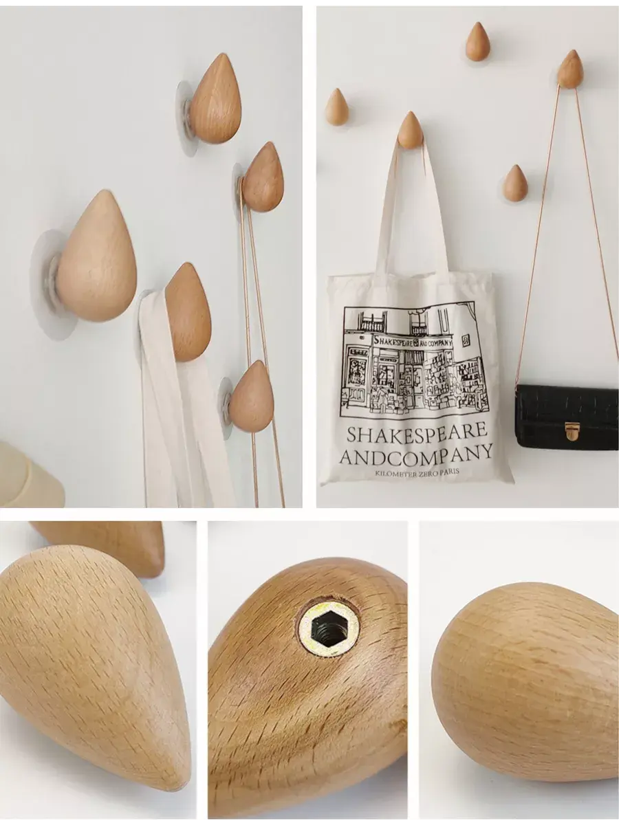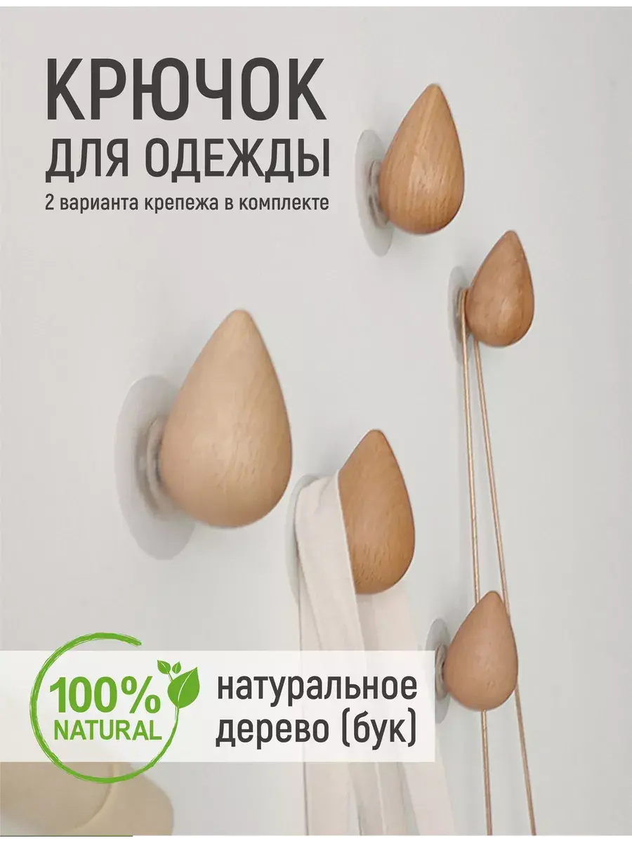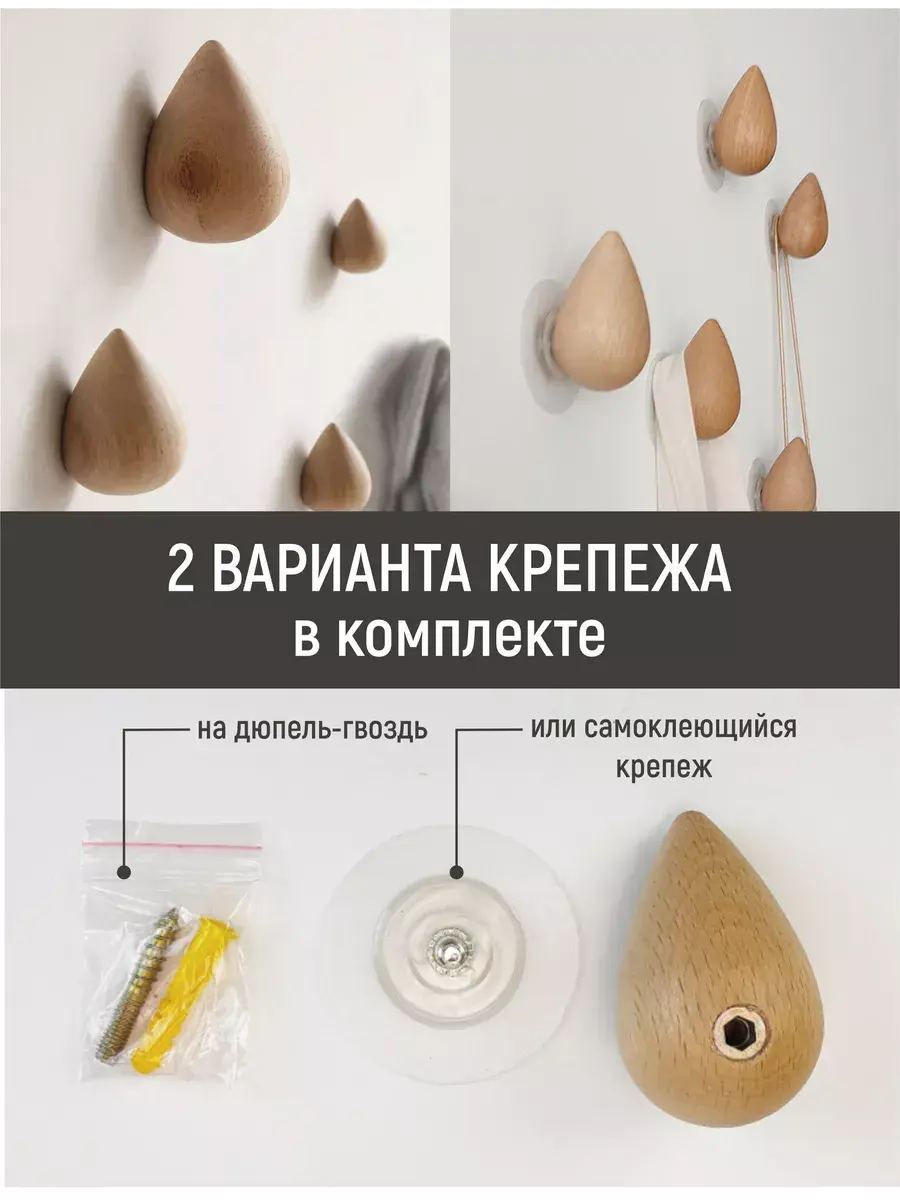 Крючок деревянный настенный самоклеющийся в виде капли из бука. В комплекте два крепления: самоклеющаяся площадка с винтом и дюбель-гвоздь - для более крепкого надежного крепления. Стильная вешалка из натурального дерева преобразит ваш интерьер и станет прекрасным лаконичным элементом декора любой комнаты вашего дома. Крючок-капля для одежды идеально подойдет для спальни, прихожей, детской, кухни в эко стиле.