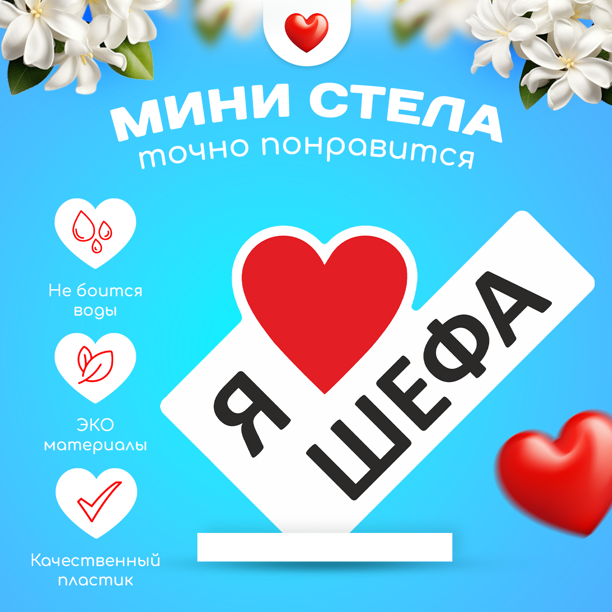 Мини стела “Я люблю шефа” - это уникальное и очаровательное произведение искусства, созданное специально для выражения искренней любви и уважения к тем, кто занимает особое место в наших сердцах. Эта стела представляет собой изящную композицию высотой около 15-20 см, выполненную из высококачественного ПВХ пластика.