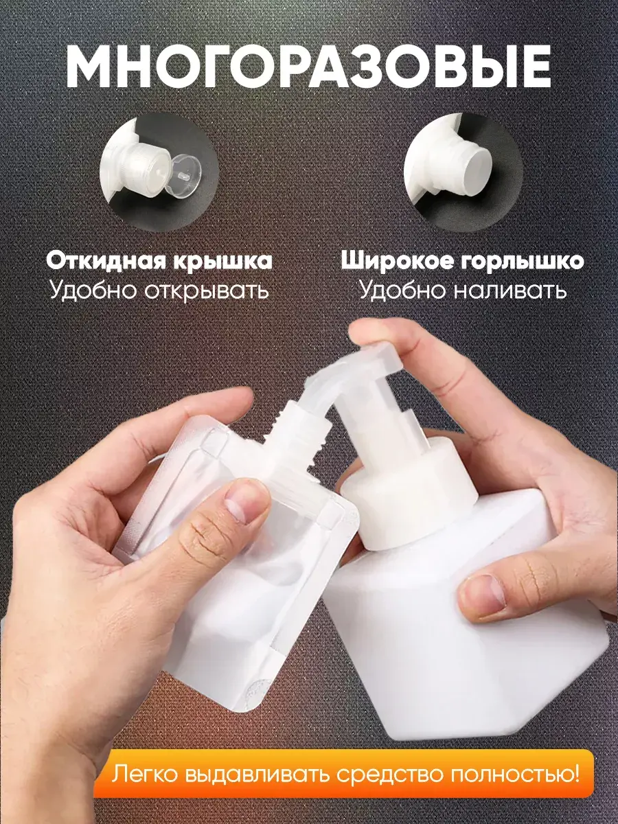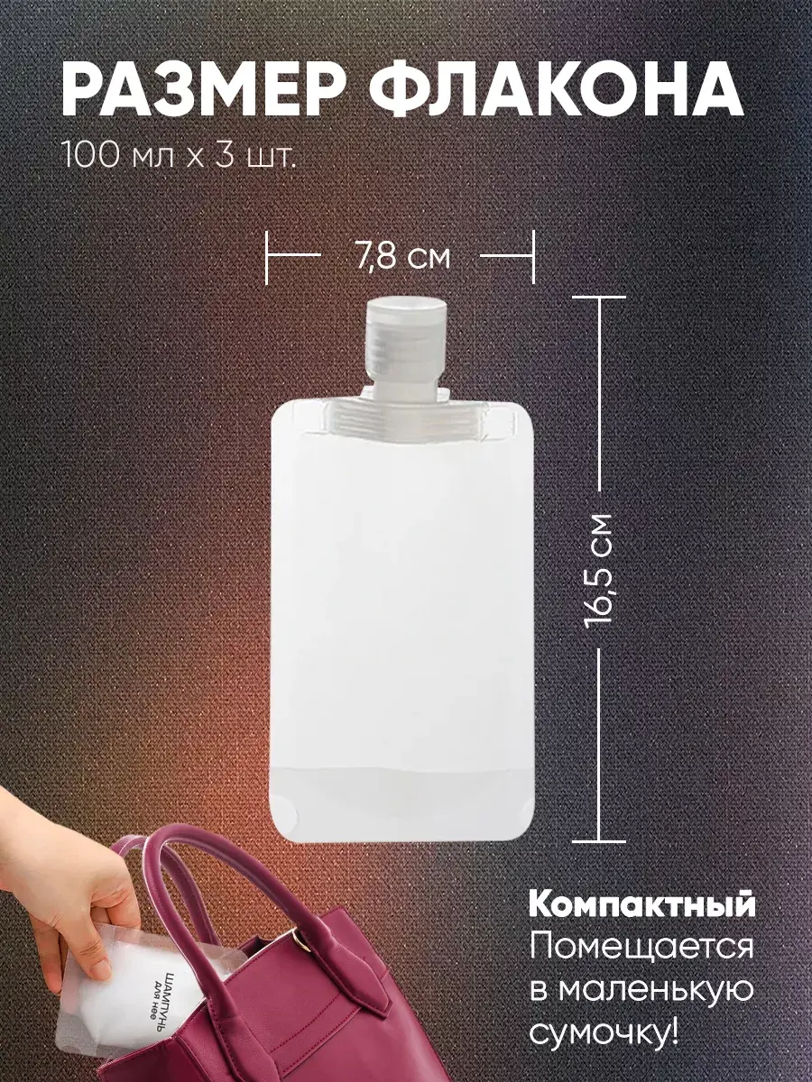 Каждый флакон имеет широкое горлышко для удобного наполнения, а также мягкую конструкцию, позволяющую легко выдавить содержимое почти без остатка. Перед переливом средств необходимо дунуть во флакон, тогда он будет наполнен на весь указанный объем и даже больше. Дорожный набор флаконов гибкого формата легко промывается для дальнейшего пользования.