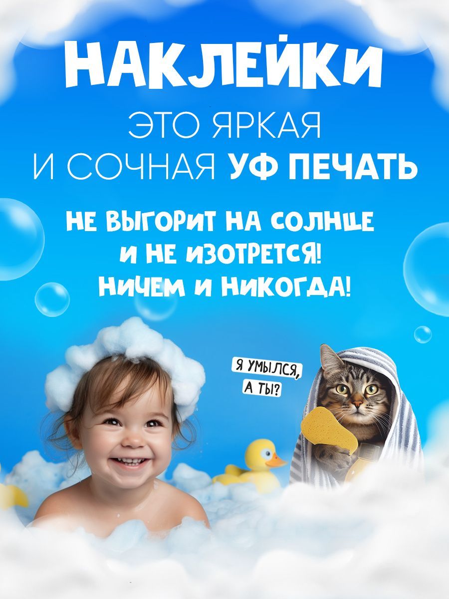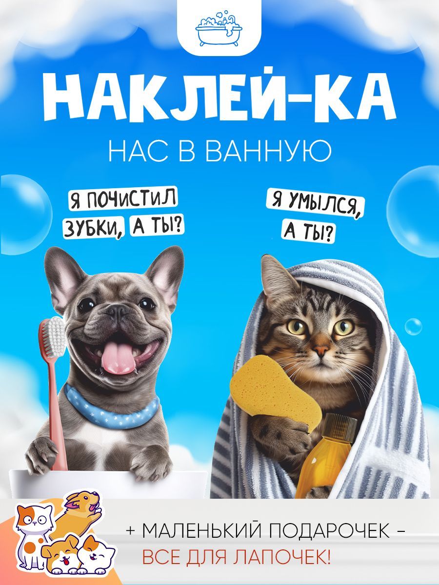 Набор наклеек с веселым псом и серьезным котом - это не только отличный способ приучить малыша к гигиене, наши шуточные веселые стикеры украсят интерьер ванной комнаты, только наклейте их на зеркало и стену ванной комнате! Наклейки напоминалки - это отличный подарок для ваших друзей и близких, которые также обожают домашних животных как вы. Основа наших интерьерных наклеек - белая виниловая самоклеющаяся пленка, подойдет для наклейки на любую гладкую поверхность. Наклейки можно клеить в ванную, на дверь, стены и мн. др. поверхности. Они так же могут закрыть дефекты, а так же украсить и разнообразить интерьер. Наши наклейки для интерьера изготовлены из высококачественного материала, что гарантирует долговечность и стойкость к истиранию. Наш набор наклеек напечатан экологически чистыми чернилами, не имеющими запаха, они абсолютно безопасны в использовании в жилых помещениях, не вызывают раздражения при контакте с кожей и поэтому безвредны для человека и животных.