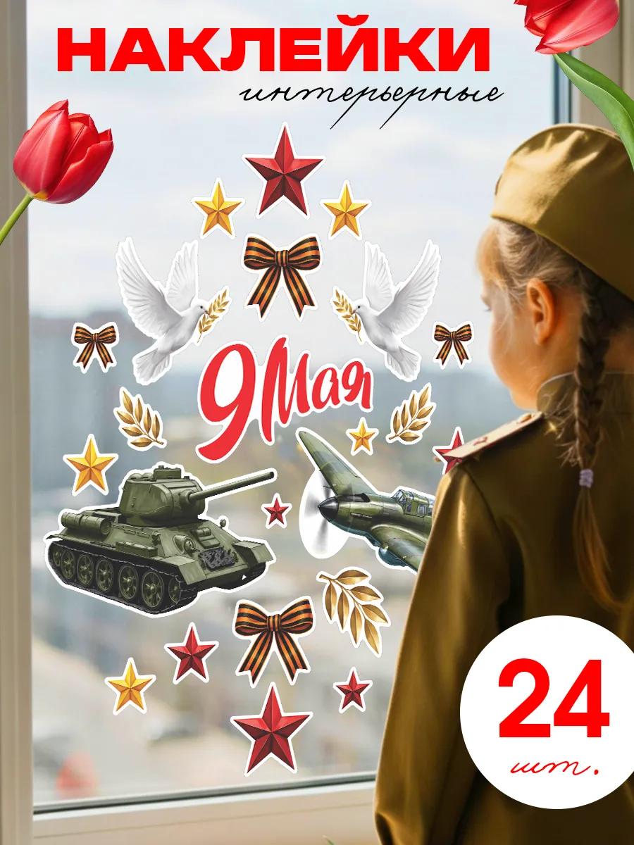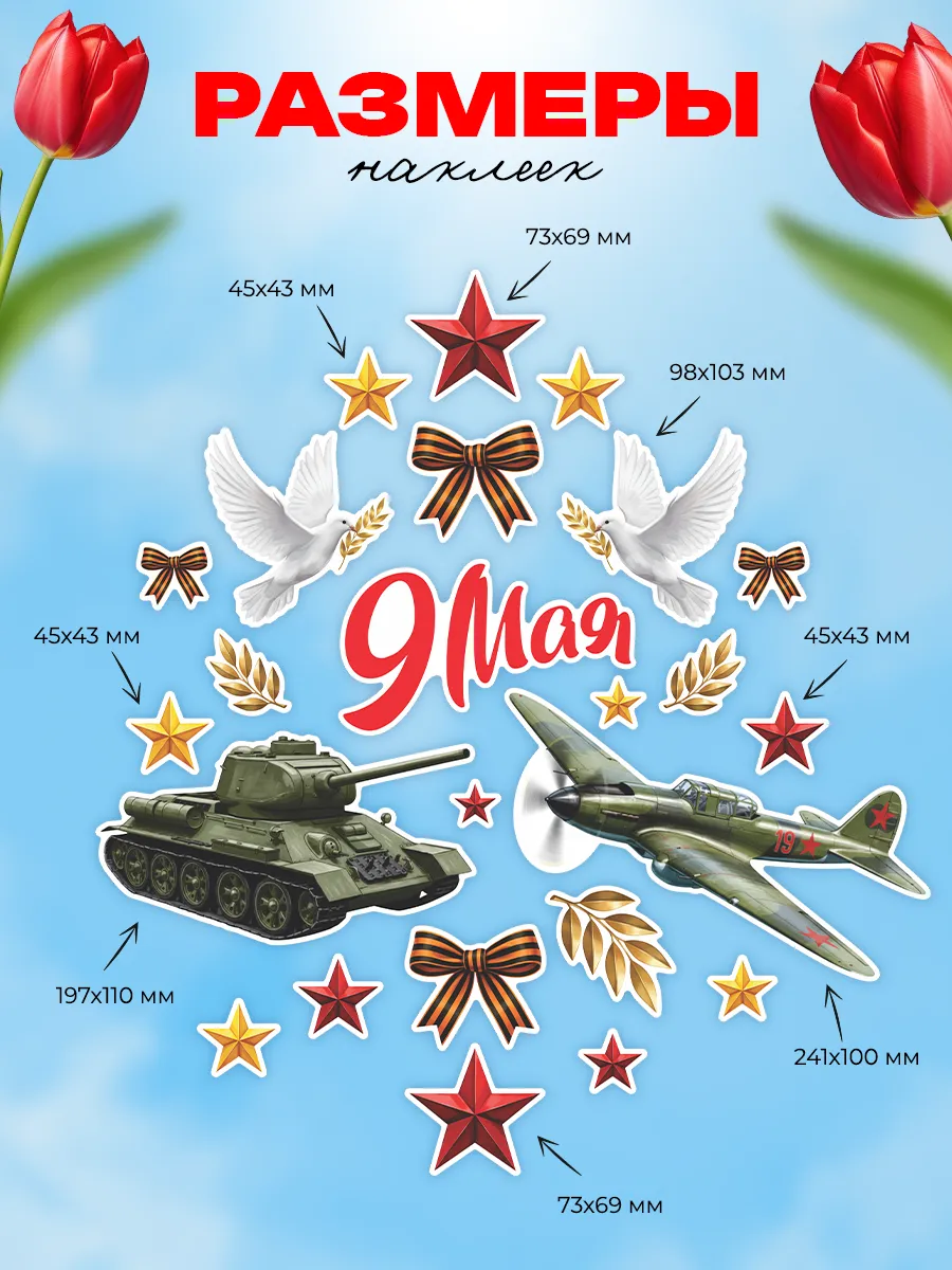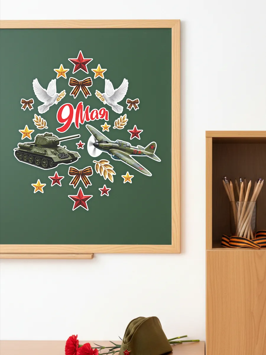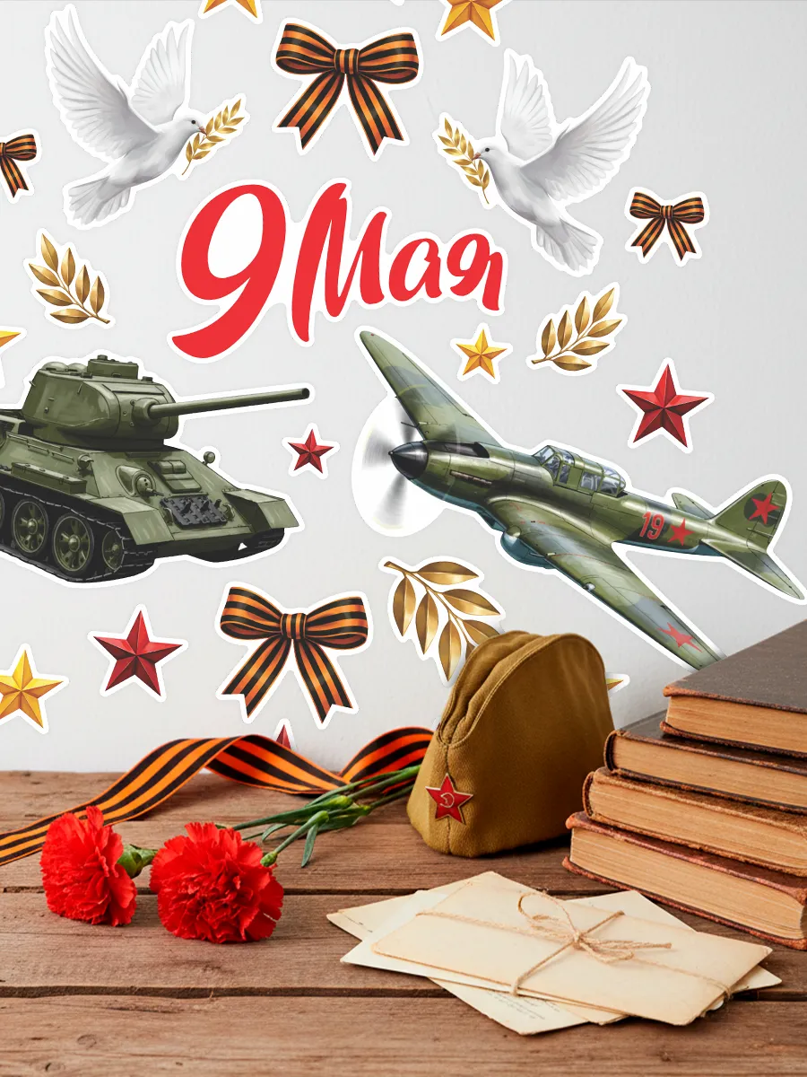 Интерьерные наклейки к 9 мая для праздничного оформления: подходят на окна, стену и зеркало. Тематика Дня Победы — голуби, звезды и символика победы — помогает быстро создать выразительный декор для дома, школы, детского сада и групп. Набор наклеек рассчитан на оформление к 9 мая без сложного монтажа: элементы легко переносятся, ровно ложатся на гладкие поверхности и аккуратно снимаются после мая, не повреждая основание при корректном использовании.