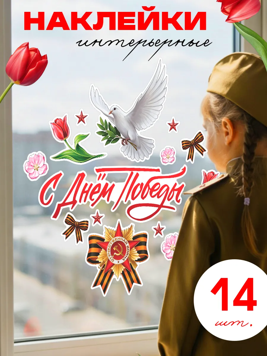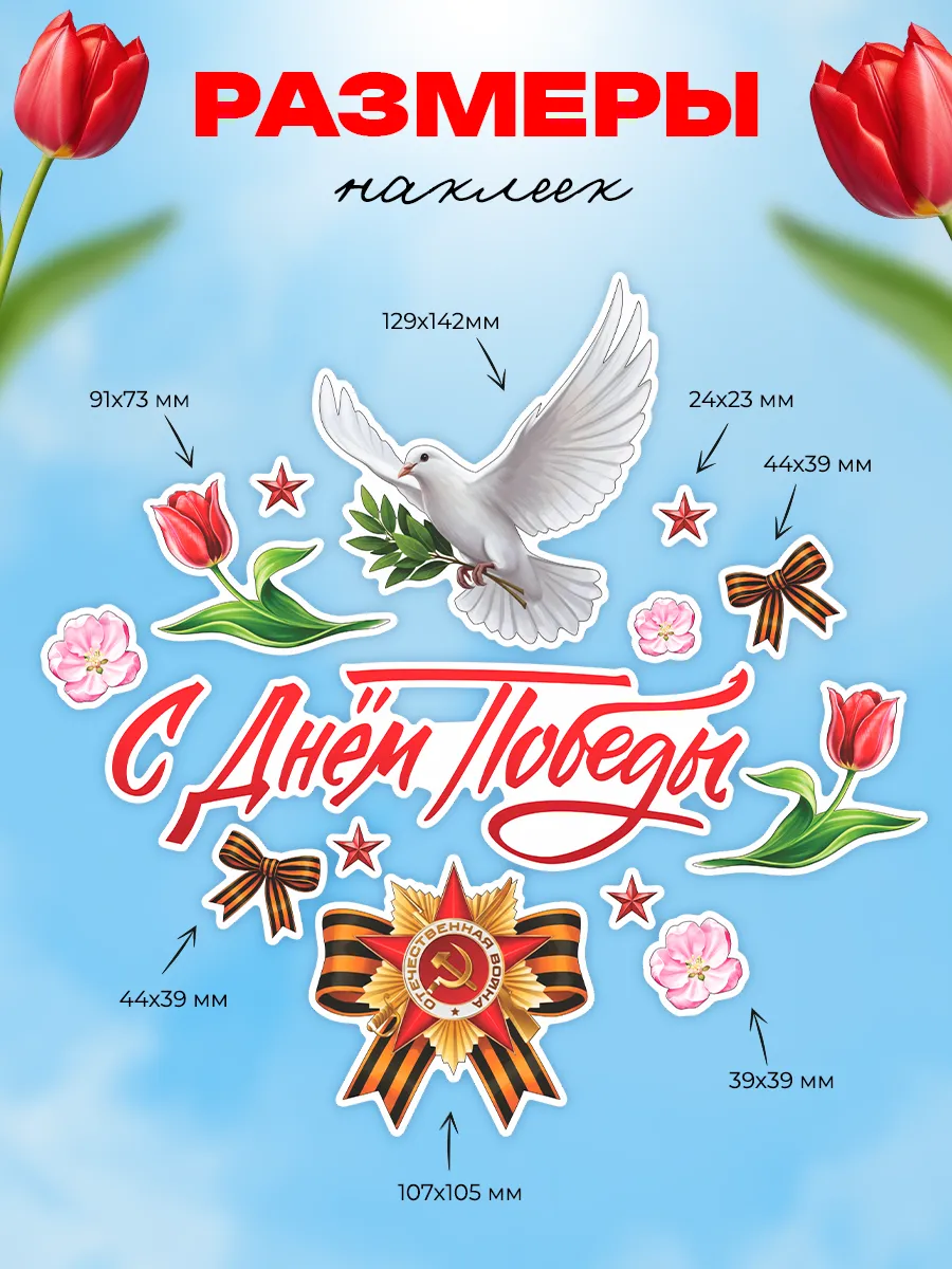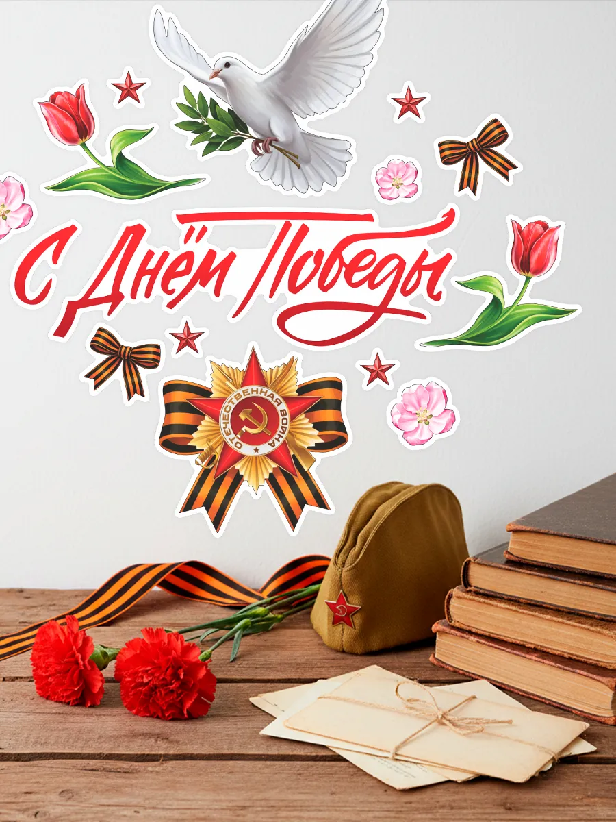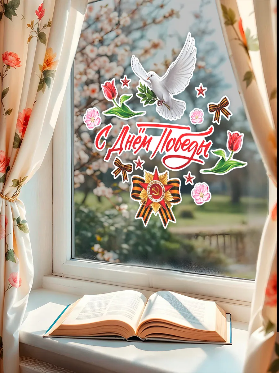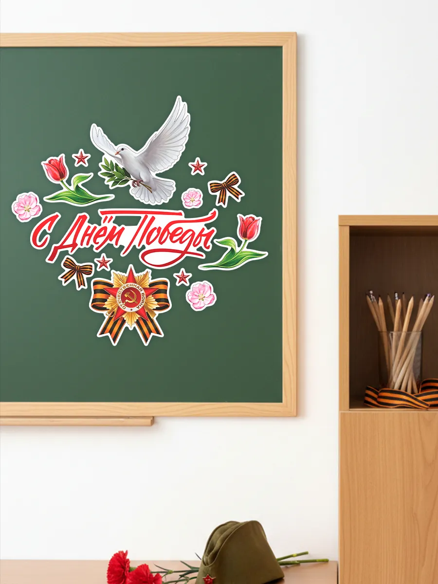 Интерьерные наклейки к 9 мая для праздничного оформления: подходят на окна, стену и зеркало. Тематика Дня Победы — голуби, звезды и символика победы — помогает быстро создать выразительный декор для дома, школы, детского сада и групп. Набор наклеек рассчитан на оформление к 9 мая без сложного монтажа: элементы легко переносятся, ровно ложатся на гладкие поверхности и аккуратно снимаются после мая, не повреждая основание при корректном использовании.