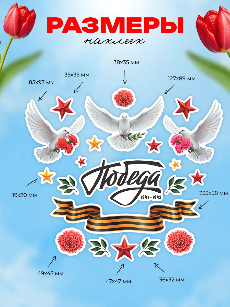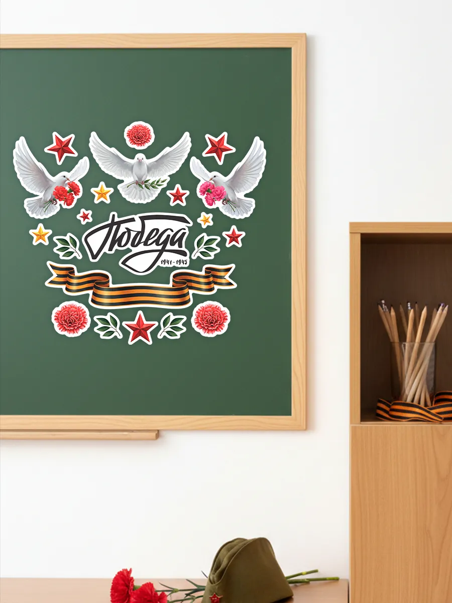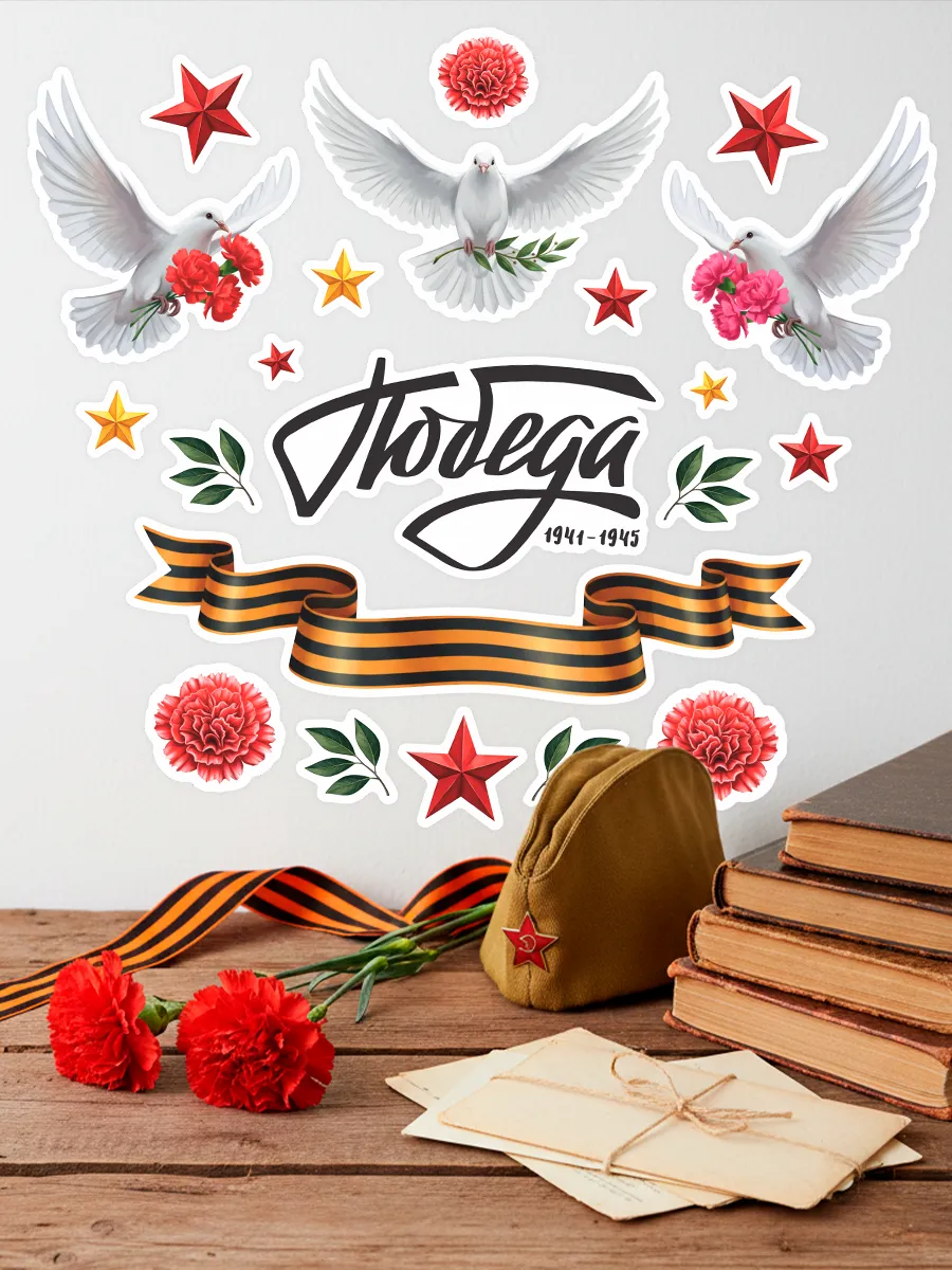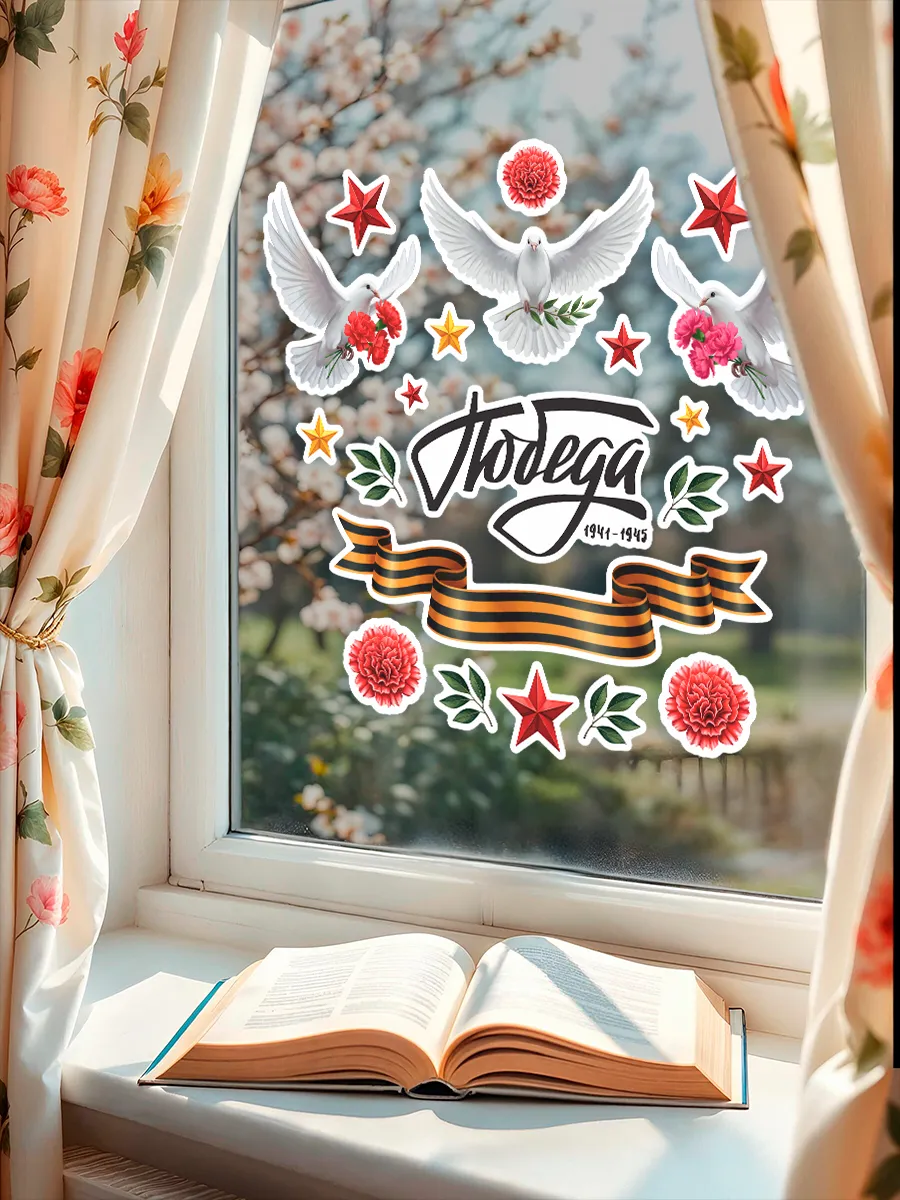 Интерьерные наклейки к 9 мая для праздничного оформления: подходят на окна, стену и зеркало. Тематика Дня Победы — голуби, звезды и символика победы — помогает быстро создать выразительный декор для дома, школы, детского сада и групп. Набор наклеек рассчитан на оформление к 9 мая без сложного монтажа: элементы легко переносятся, ровно ложатся на гладкие поверхности и аккуратно снимаются после мая, не повреждая основание при корректном использовании.