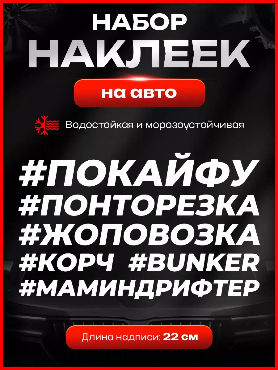 Наши наклейки на автомобиль покайфу, понторезка, жоповозка, корч, bunker, маминдрифтер - для пацанских машин, подойдут для парней, для неординарных мужчин. А может быть какую то надпись захочет приобрести себе и девушка.