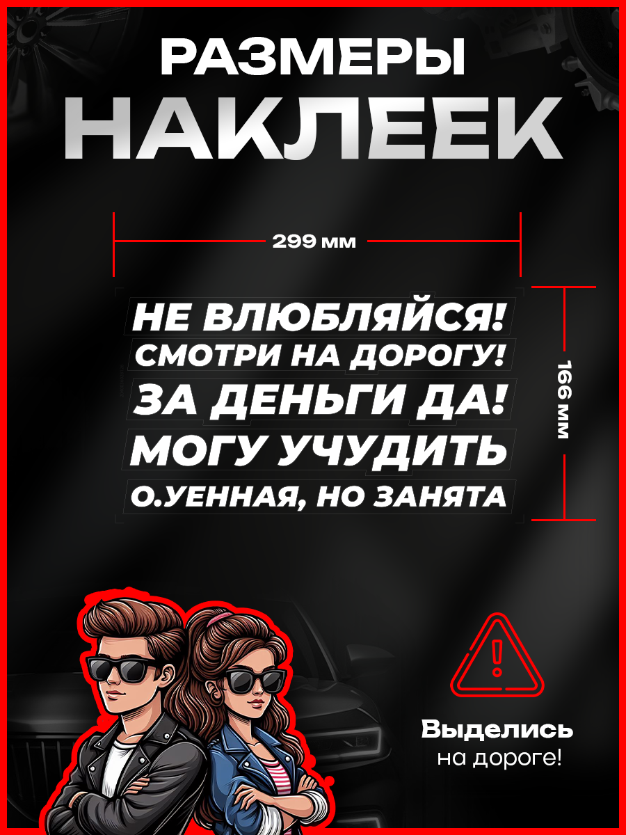 Стикеры с надписями для автоледи: не влюбляйся; смотри на дорогу, за деньги да!; могу учудить; о.уенная, но занята; могут быть не только стильным элементом дизайна, но и способом выразить свою индивидуальность. Также, не стоит забывать, что наклейки на авто могут служить отличным подарком для ваших друзей и подруг. Вы можете выбрать наклейку, которая отражает их интересы и подарить ее в качестве необычного сюрприза. Это будет не только оригинальный подарок, но и позволит им добавить немного юмора к своему автомобилю. Таким образом, оригинальные наклейки представляют собой не только стильный и модный аксессуар, но и способ выделиться на дороге.