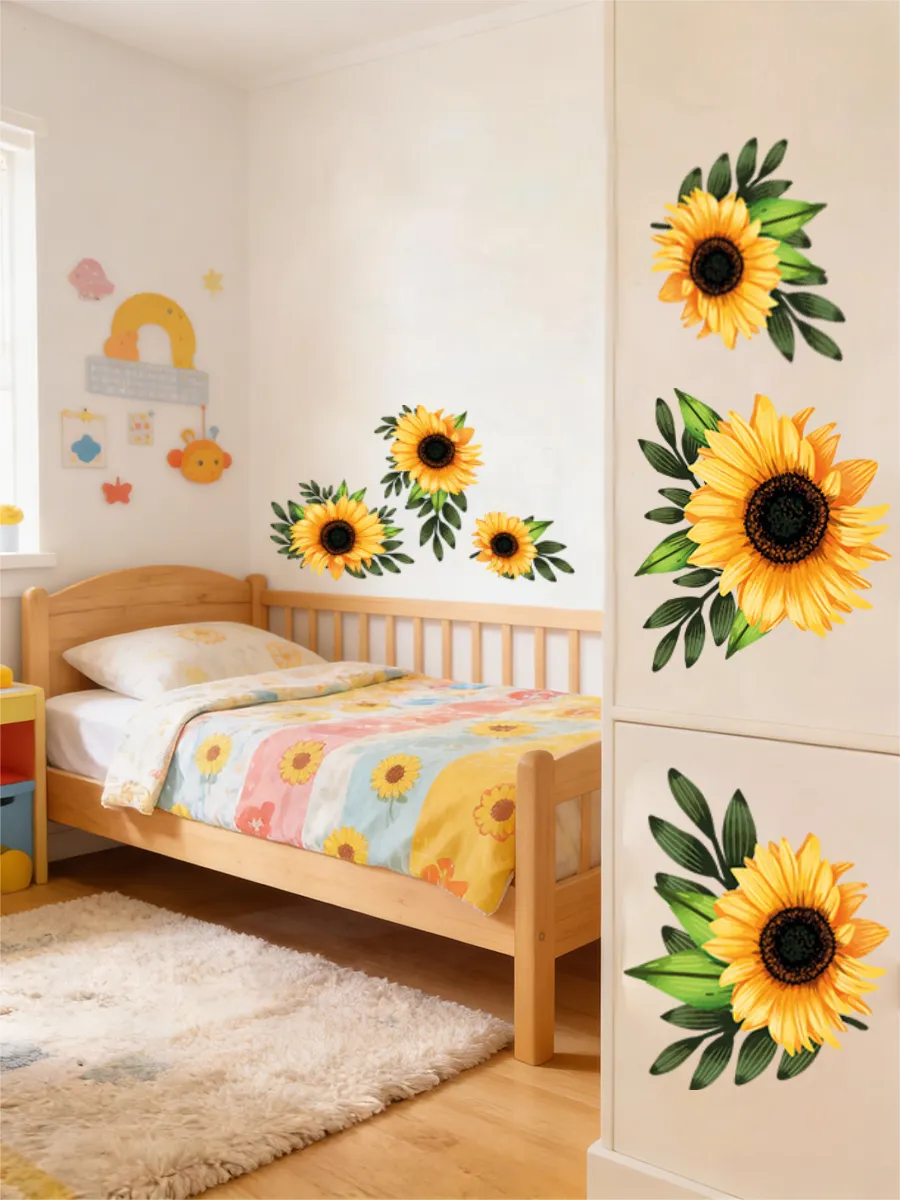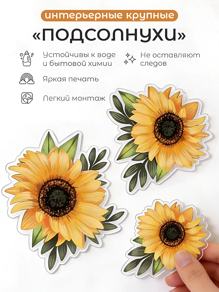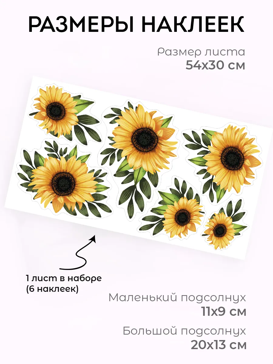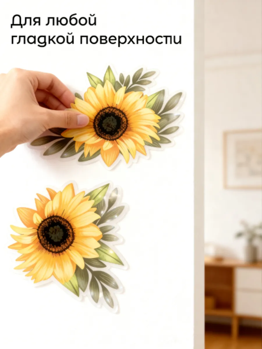 С помощью этого набора возможно оформление не только стен, но и дверей, мебели, холодильников или даже окон – наклейки плотно держатся, не оставляют следов и легко снимаются при необходимости изменить декор. Подсолнухи выступают универсальными украшениями для любого стиля: от классики до современного минимализма. Цветок с солнечными лепестками акцентирует внимание и придаёт комнате индивидуальность, а гармоничное сочетание оттенков позволяет собрать органичный ансамбль в любом помещении.