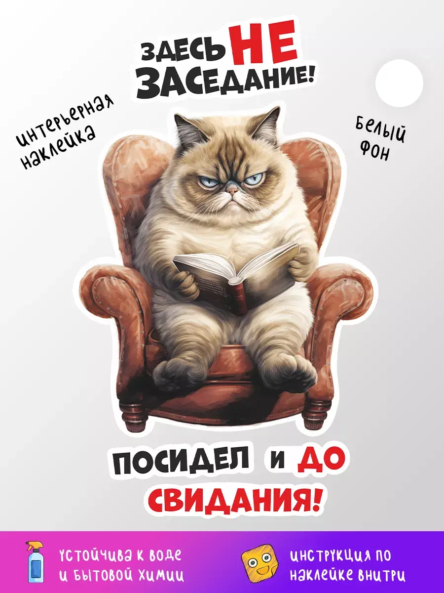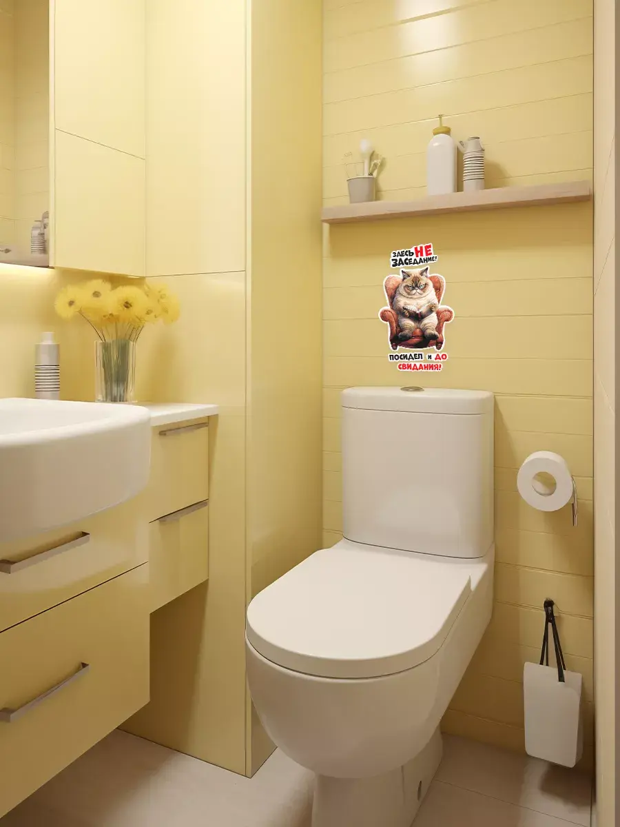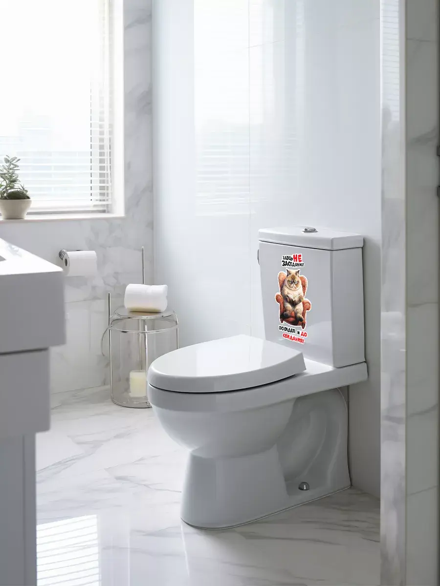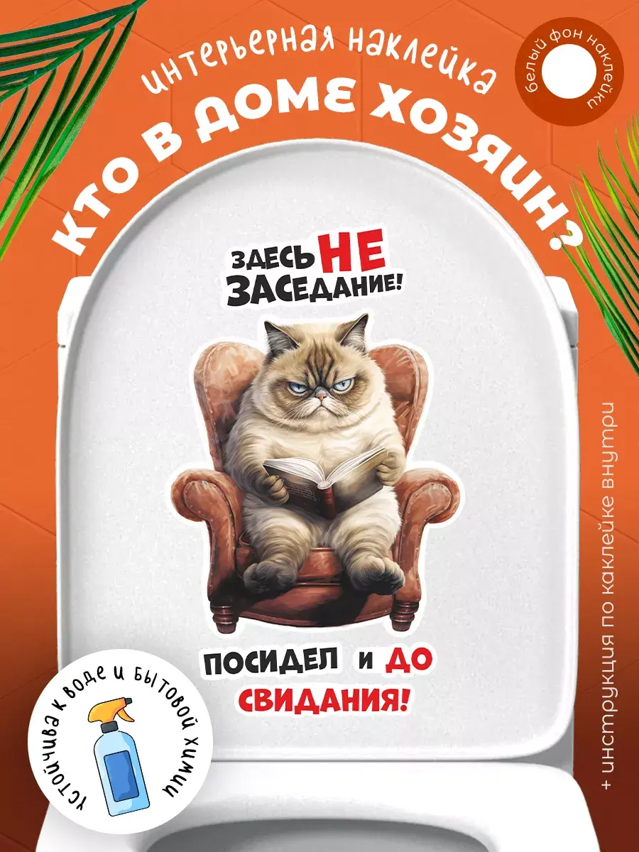Ваша ванная комната или туалет станут еще уютнее и забавнее благодаря этой замечательной наклейке с котом на крышке унитаза! Этот веселый, позитивный и милый элемент декора внесет радость в любой дом. Стильная надпись «Здесь не заседание, посидел и до свидания» придаст особый шарм вашему пространству, а возможность менять положение наклейки позволит подогнать её под ваши предпочтения. Наклейка выполнена из высококачественных материалов – водонепроницаемой белой пленки, которая прекрасно переносит условия высокой влажности, характерные для ванных комнат и туалетов. Благодаря этому она прослужит долго, сохраняя свой первоначальный вид. Качественная печать обеспечивает четкие цвета и детализацию изображения даже при близком рассмотрении. Это отличный способ добавить индивидуальности и стиля в пространство вашего дома без значительных затрат времени и денег. Котик, который смотрится так грозно, на самом деле очень добрый и обязательно принесет улыбку каждому, кто его увидит. Не упускайте возможности превратить обычную ванную комнату или туалет в место, полное радости и хорошего настроения с этим прекрасным декором!