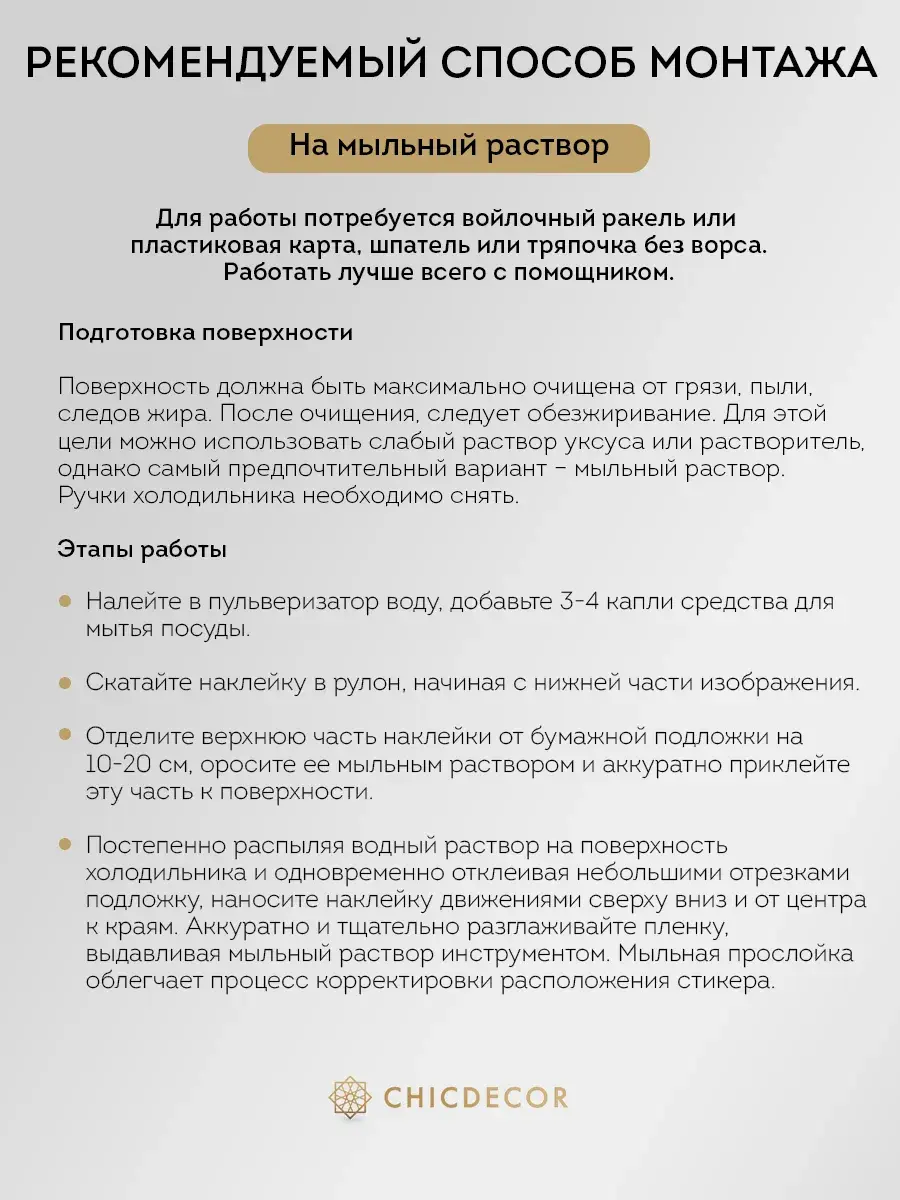 Наклейка на холодильник от CHIC DECOR - это прекрасный способ добавить яркий акцент в интерьер вашей кухни. Большая наклейка станет настоящим украшением вашего холодильника, преобразив его в стильный элемент декора, добавив яркий акцент в декор вашего дома. Изготовленная из высококачественного плотного винила, наклейка проста в нанесении и удалении, не оставляя следов на поверхности. Преимущества наклеек CHIC DECOR - ГЛЯНЦЕВАЯ ЛАМИНАЦИЯ Наклейка с нашей ламинацией не выгорает на солнце: яркие цвета останутся насыщенными на долгие годы! Защита поверхности: Ламинация создает прочный защитный слой, который предохраняет наклейку от износа, царапин, выцветания и других повреждений. Это продлевает срок службы наклейки. Не боится воды и бытовой химии: легко моется и устойчива к повседневным загрязнениям. Улучшенный внешний вид: Глянцевая поверхность придает наклейке более яркий, насыщенный и привлекательный внешний вид. Она создает эффект "глубины" и "объема" изображения. Легкость ухода: Глянцевая ламинация делает поверхность более гладкой и устойчивой к загрязнениям. Ее легко протирать и очищать. Наклейка устойчива к истиранию: сохраняет свой первозданный вид даже при интенсивном использовании. Простой монтаж и демонтаж: Ламинированная поверхность меньше склонна к образованию пузырьков и складок между наклейкой и основой, что упрощает процесс наклеивания и обеспечивает ровное прилегание. Плотная глянцевая ламинация уплотняет наклейку, что существенно упрощает процесс монтажа и демонтажа. Преобразите свою кухню за считанные минуты с яркой и стильной наклейкой на холодильник от CHIC DECOR! Размер 65х200 см идеально подойдет для большинства стандартных холодильников, а глянцевая ламинация придаст изображению глубину и насыщенность. Забудьте о выцветших и потертых наклейках! Наша наклейка изготовлена с использованием японской печати и немецкой пленки, что гарантирует высокое качество изображения, устойчивость к ультрафиолету, воде, бытовой химии и истиранию. Подробнее о нашем качестве: Японское качество печати: Гарантирует четкость и яркость изображения. Немецкое качество пленки: Обеспечивает долговечность и устойчивость к повреждениям. Бережная упаковка в прочный тубус: Наклейка доедет до вас в целости и сохранности. Обновите интерьер кухни без лишних затрат! Интерьерный декор на холодильник от CHIC DECOR - новый стильный акцент в вашем доме. CHIC DECOR - это стиль, защита и долговечность!