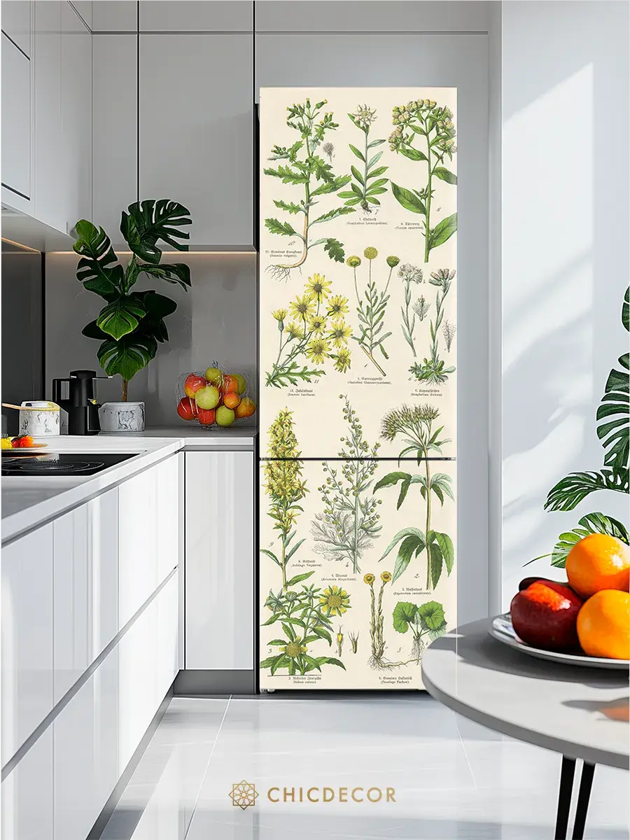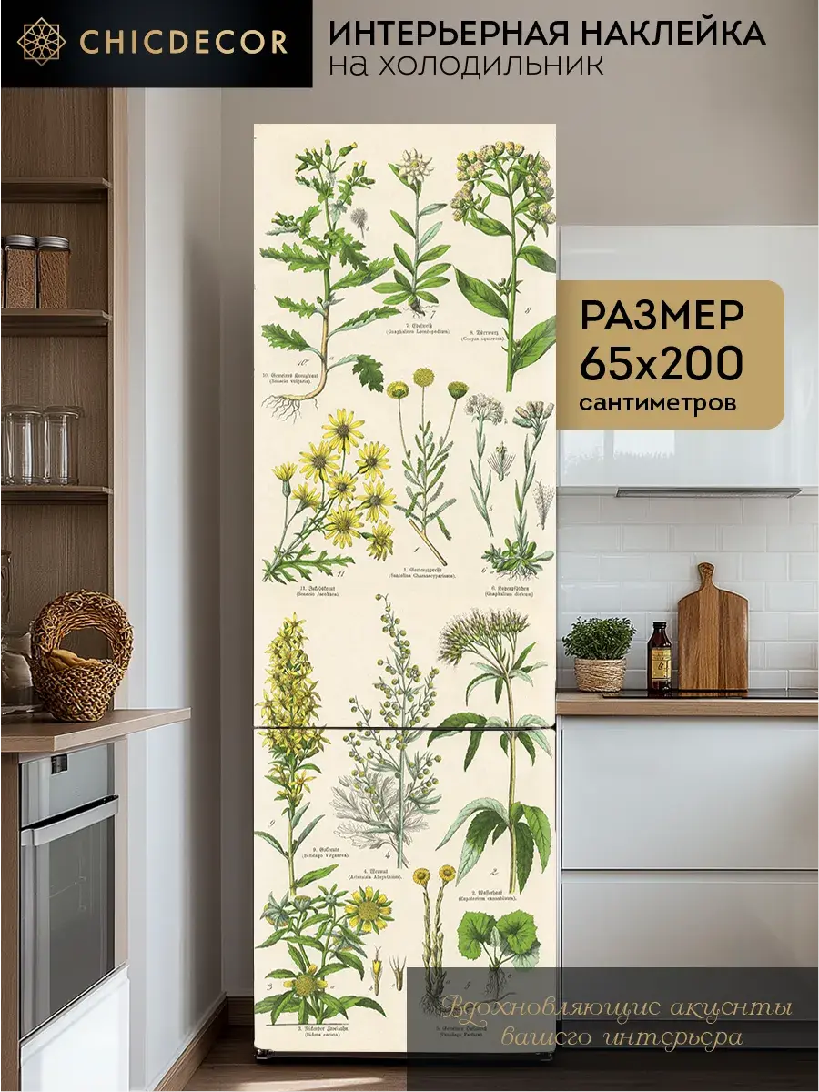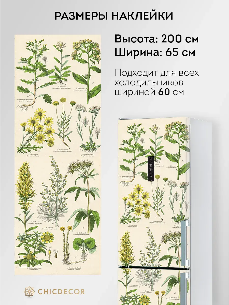 Наклейка на холодильник "Гербарий" от CHIC DECOR - это прекрасный способ добавить яркий и познавательный акцент в интерьер вашей кухни. Большая и красочная светлая наклейка в бежевых тонах с изображением лекарственных растений и подписями к ним из старинной книги станет настоящим украшением вашего холодильника, преобразив его в стильный элемент декора, добавив яркий акцент в декор вашего дома. Изготовленная из высококачественного плотного винила, наклейка проста в нанесении и удалении, не оставляя следов на поверхности.