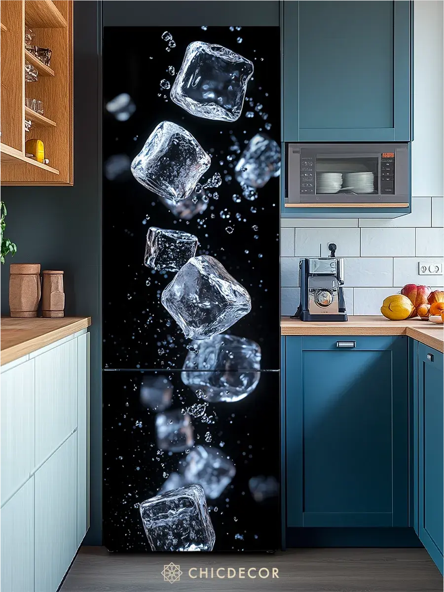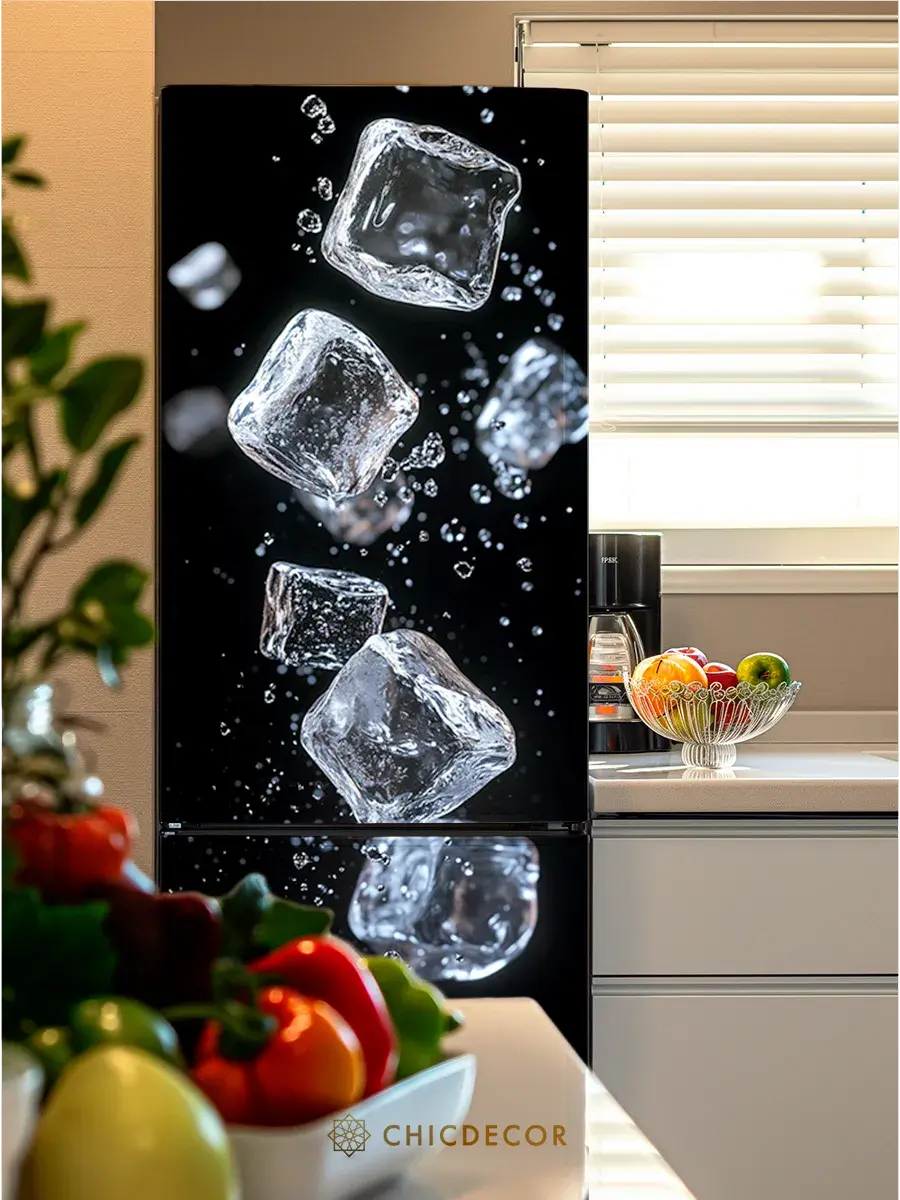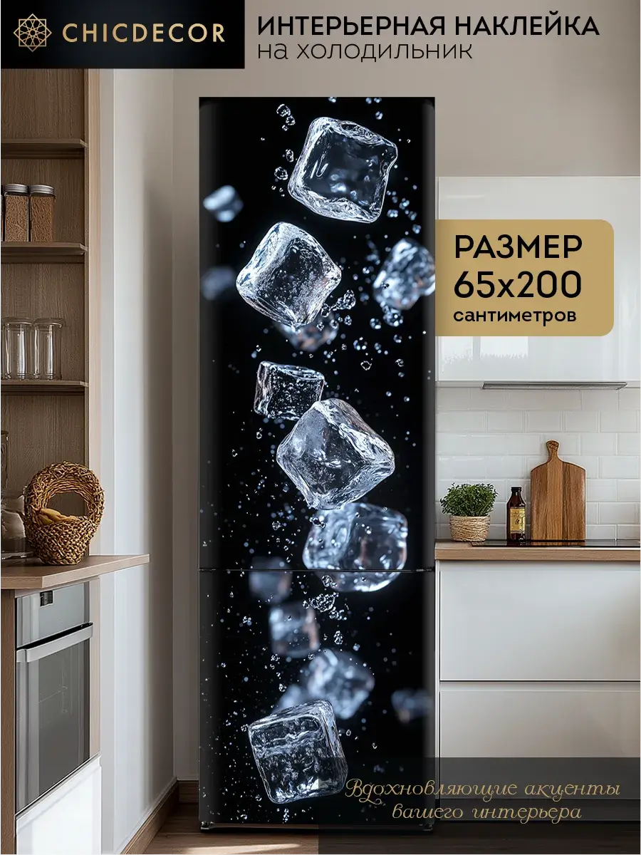 Наклейка на холодильник "Кубики льда" от CHIC DECOR - это прекрасный способ добавить яркий акцент в интерьер вашей кухни. Большая и красочная наклейка с макро изображением кубиков льда и пузырей на черном фоне станет настоящим украшением вашего холодильника, преобразив его в стильный элемент декора. Изготовленная из высококачественного плотного винила, наклейка проста в нанесении и удалении, не оставляя следов на поверхности.