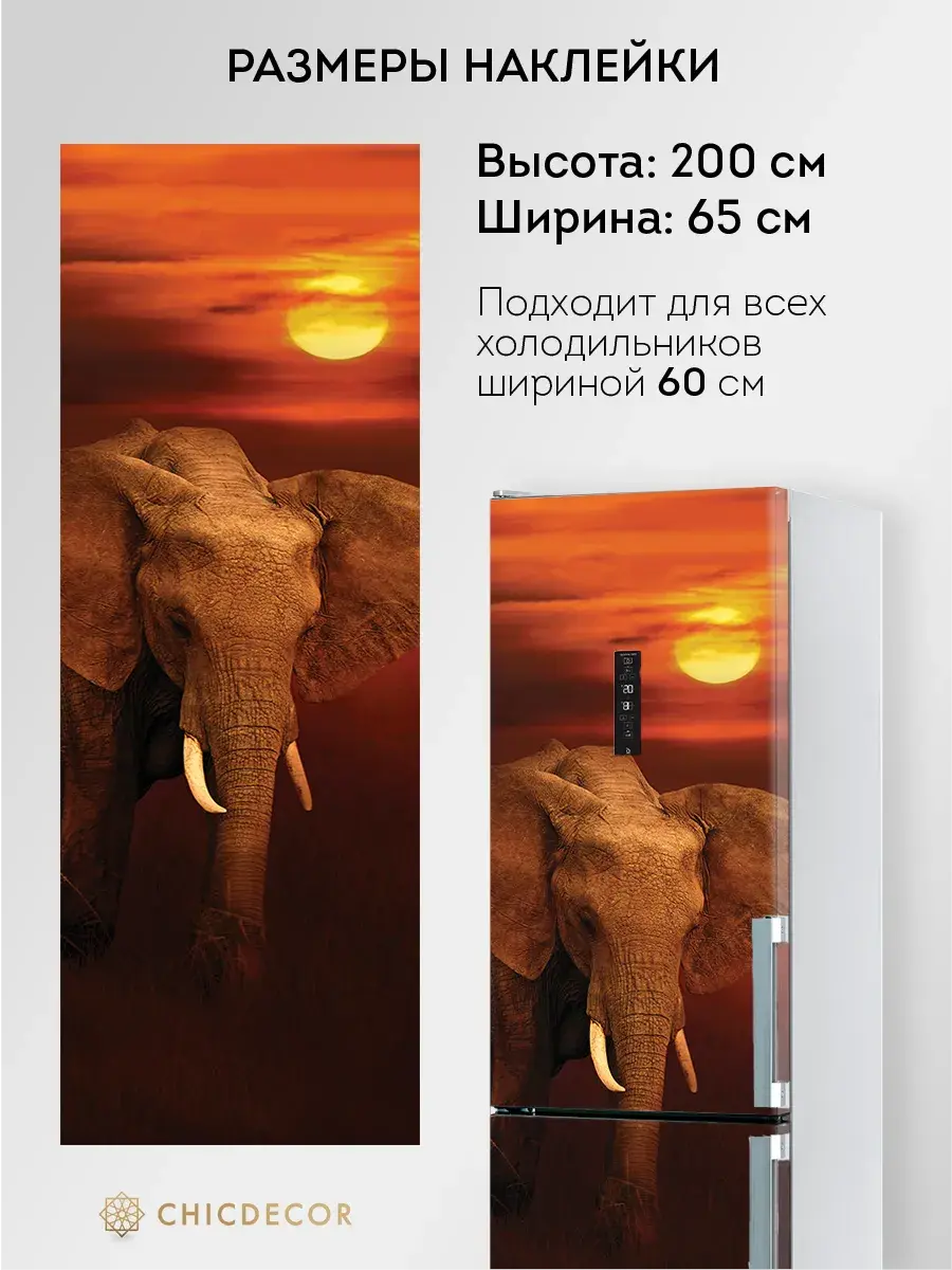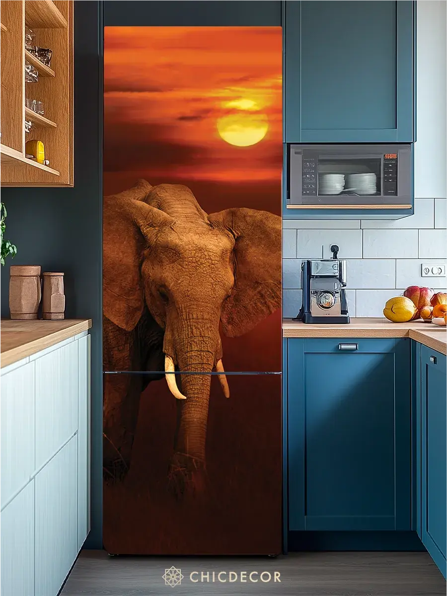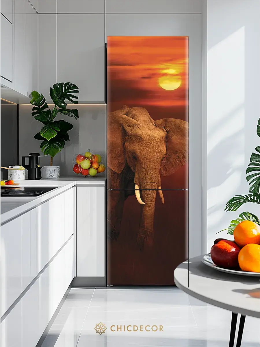 Наклейка на холодильник "Слон и солнце" от CHIC DECOR - это прекрасный способ добавить яркий акцент в интерьер вашей кухни. Большая и красочная наклейка с изображением слона в закатном слонце станет настоящим украшением вашего холодильника, преобразив его в стильный элемент декора, добавив яркий акцент в декор вашего дома. Изготовленная из высококачественного плотного винила, наклейка проста в нанесении и удалении, не оставляя следов на поверхности.