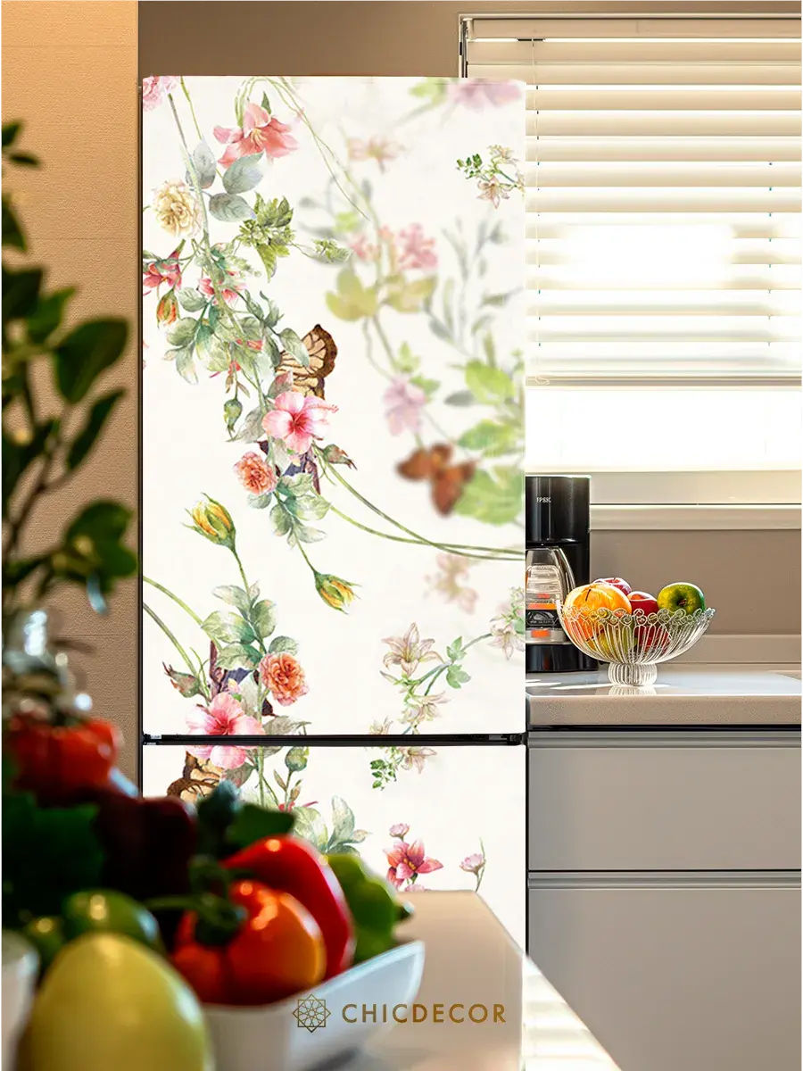 Наклейка на холодильник "Цветы и бабочки" от CHIC DECOR - это прекрасный способ добавить яркий акцент в интерьер вашей кухни. Большая и красочная светлая наклейка в бежевых тонах с изображением ярких цветов и бабочек станет настоящим украшением вашего холодильника, преобразив его в стильный элемент декора, добавив яркий акцент в декор вашего дома. Изготовленная из высококачественного плотного винила, наклейка проста в нанесении и удалении, не оставляя следов на поверхности.