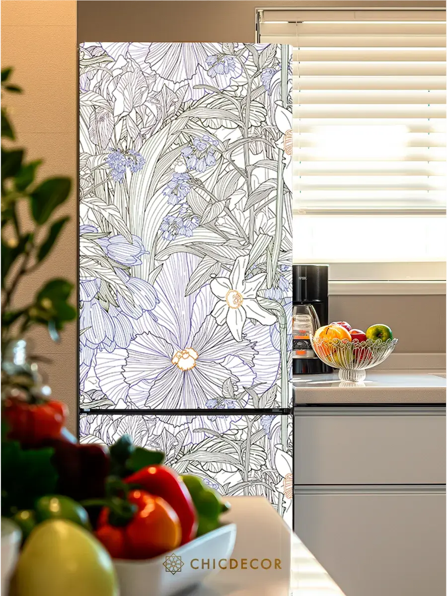 Наклейка на холодильник "Флористический рисунок" от CHIC DECOR - это прекрасный способ добавить яркий акцент в интерьер вашей кухни. Большая наклейка с изображением цветов цветными линиями на белом фоне станет настоящим украшением вашего холодильника, преобразив его в стильный элемент декора, добавив яркий акцент в декор вашего дома. Изготовленная из высококачественного плотного винила, наклейка проста в нанесении и удалении, не оставляя следов на поверхности.