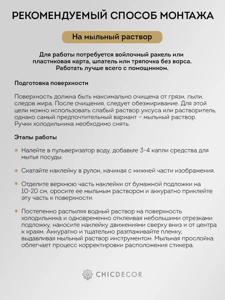 В случае если поверхность холодильника имеет нестандартные размеры, наклейка легко адаптируется с помощью обычных ножниц или канцелярского ножа. Продукт подходит также для наклеивания на стену, а также другие ровные и гладкие поверхности, включая шкафы, двери и панели.