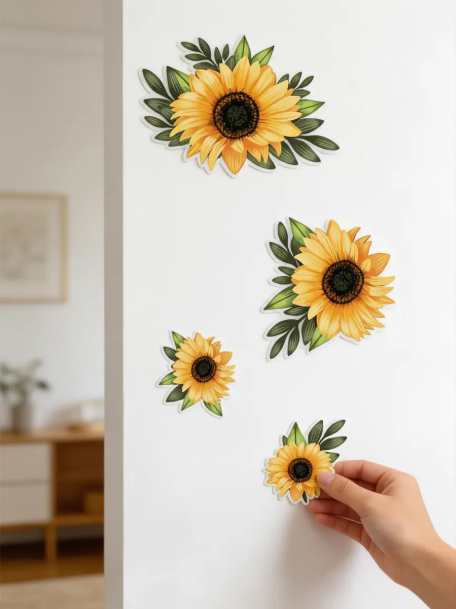 С помощью этого набора возможно оформление не только стен, но и дверей, мебели, холодильников или даже окон – наклейки плотно держатся, не оставляют следов и легко снимаются при необходимости изменить декор. Подсолнухи выступают универсальными украшениями для любого стиля: от классики до современного минимализма. Цветок с солнечными лепестками акцентирует внимание и придаёт комнате индивидуальность, а гармоничное сочетание оттенков позволяет собрать органичный ансамбль в любом помещении.