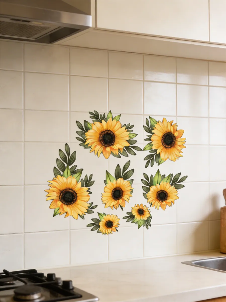 Яркий и оригинальный декор – эффективный способ преобразить пространство дома и создать индивидуальный стиль. Наклейки в виде подсолнухов для стен отлично подходят для украшения как кухни, так и любых других комнат. Декор предназначен для простой фиксации на гладких поверхностях, благодаря чему оформить стену, холодильник или другую часть интерьера можно самостоятельно, быстро и без лишних затрат.