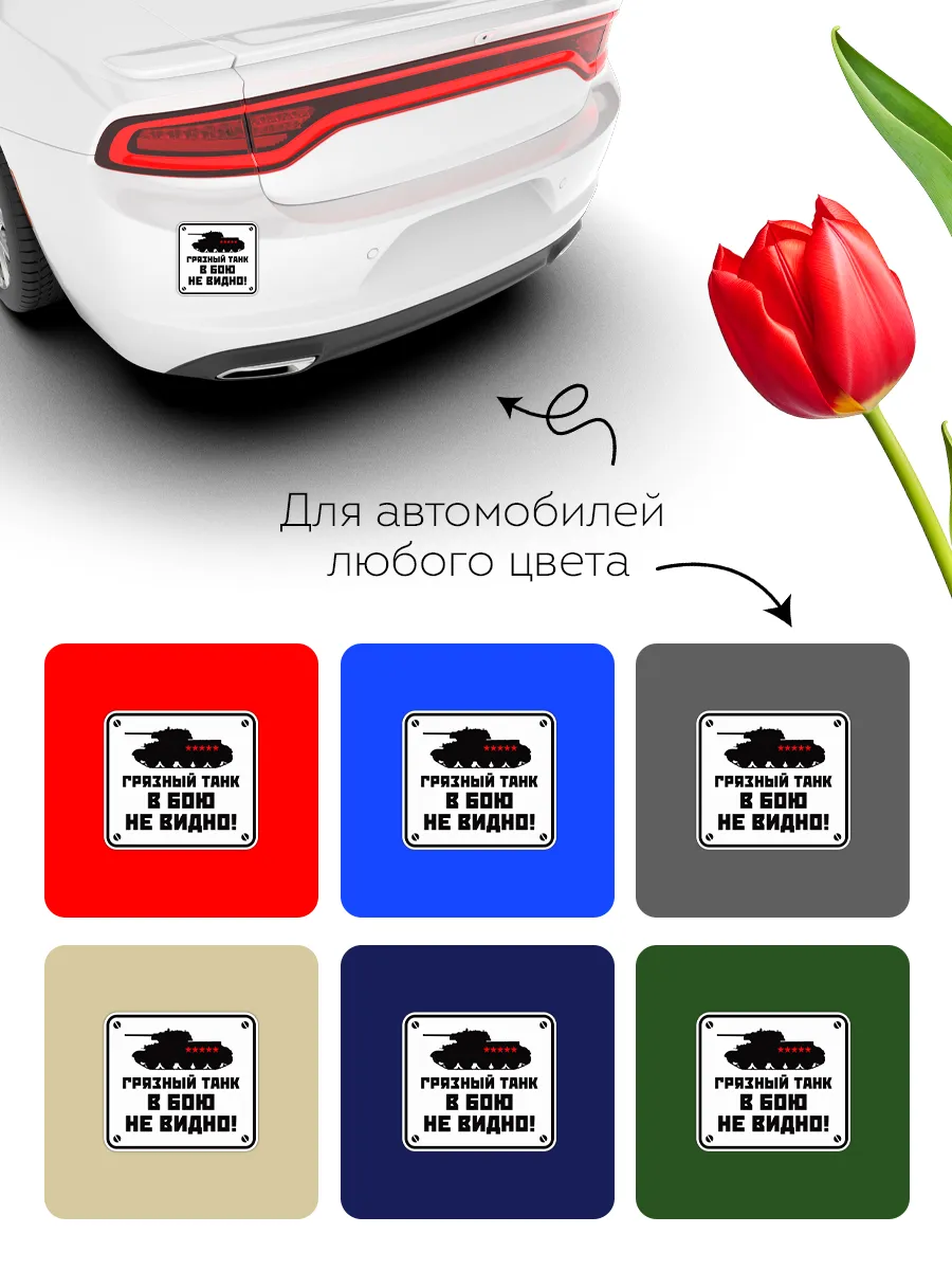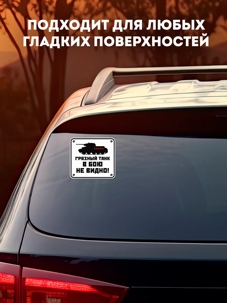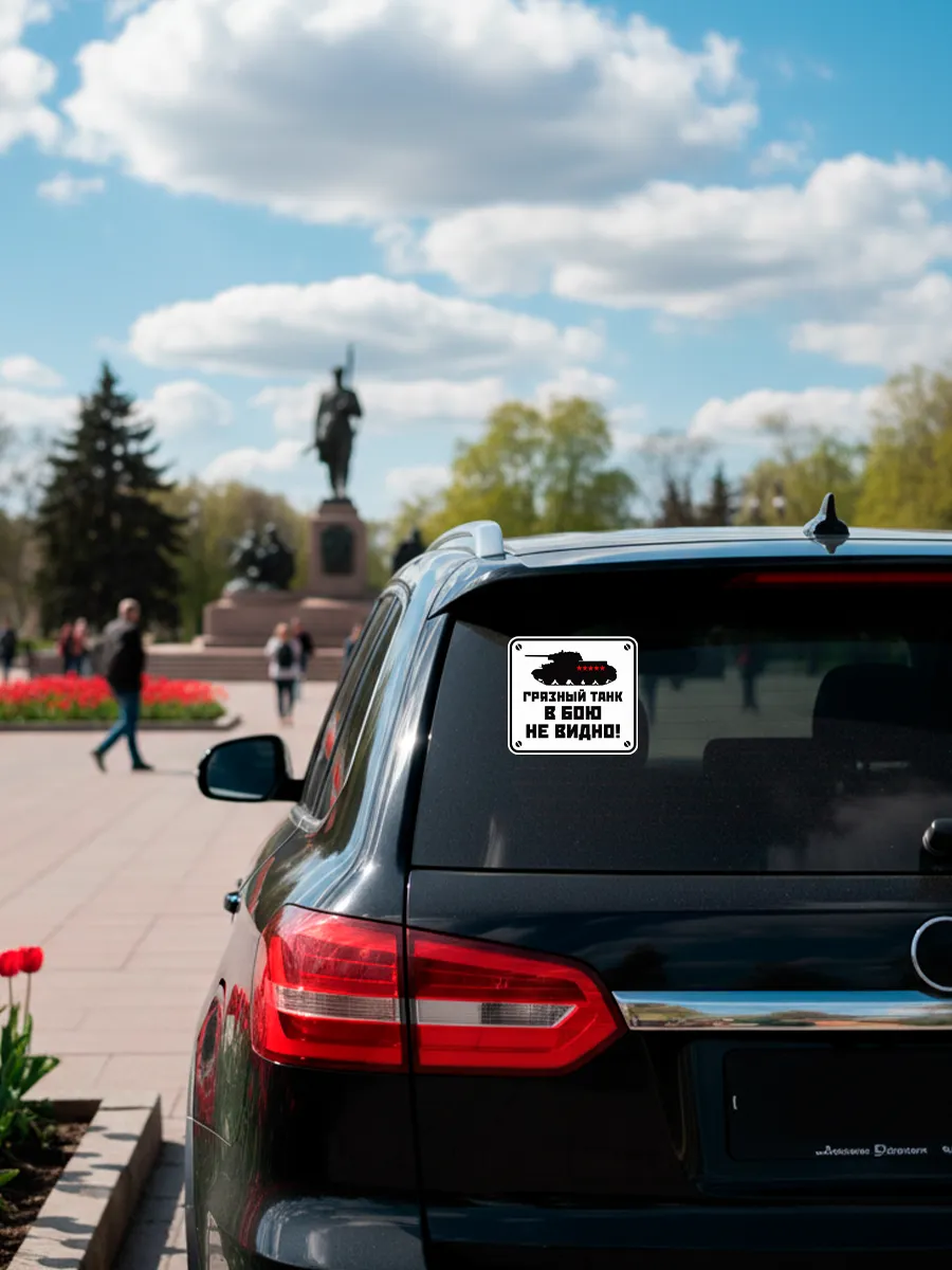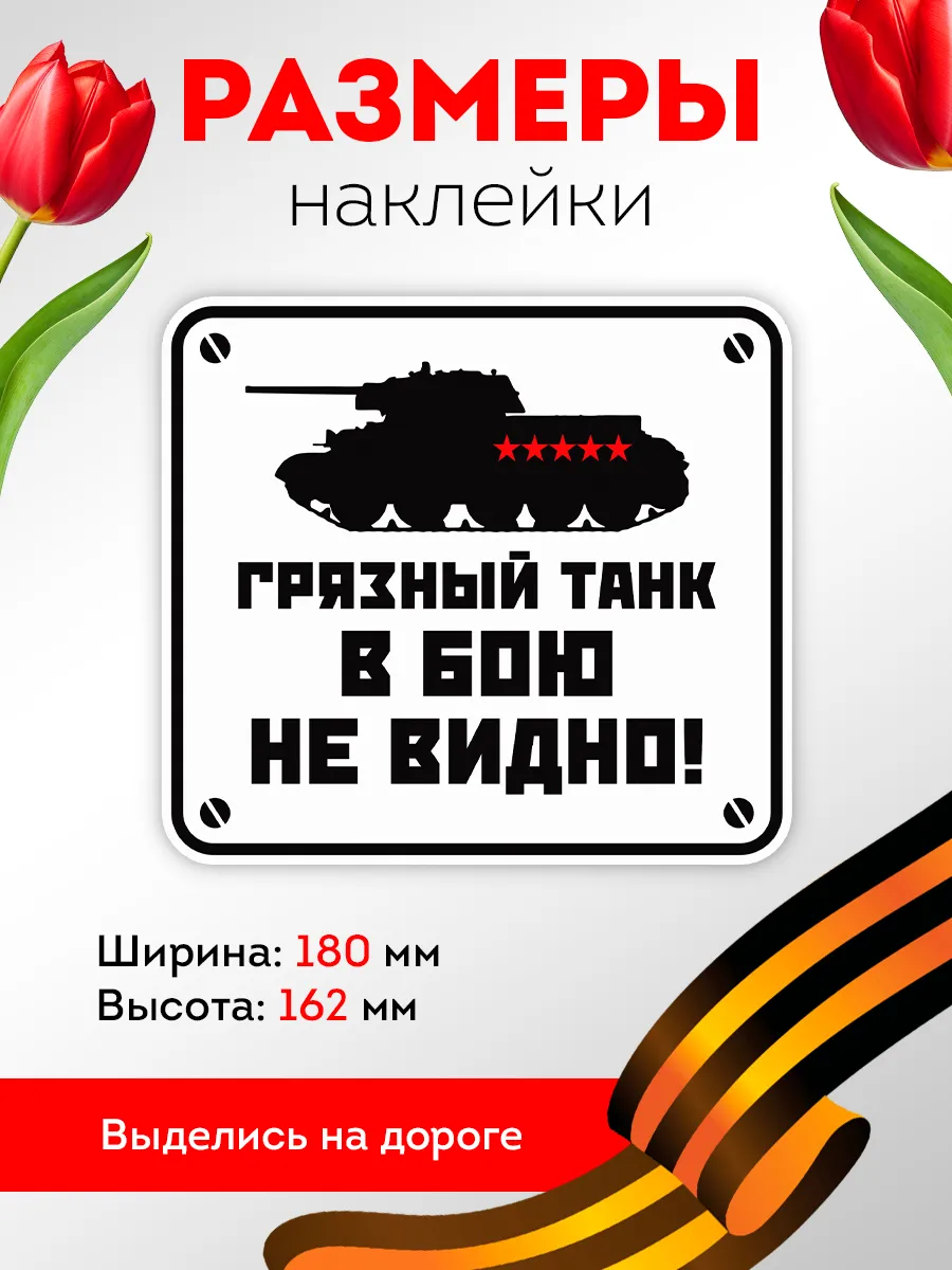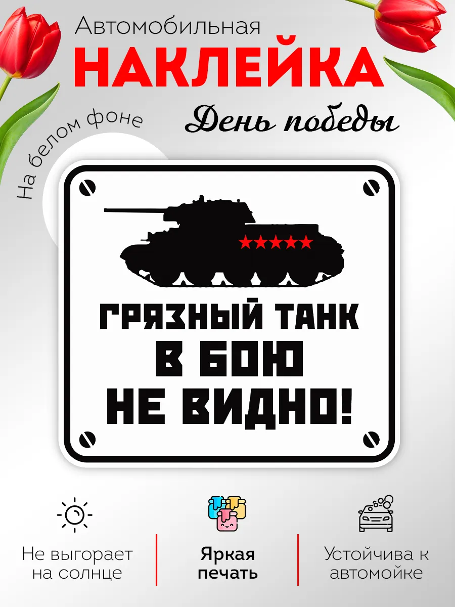 Этот автостикер 9 мая выполнен по мотивам известной армейской поговорки и станет не просто украшением, а настоящим акцентом вашего автомобиля. Изображение боевой машины с надписью "Грязный танк в бою не видно" идеально подходит для водителей с чувством юмора, которые ценят оригинальный подход к праздничному оформлению.