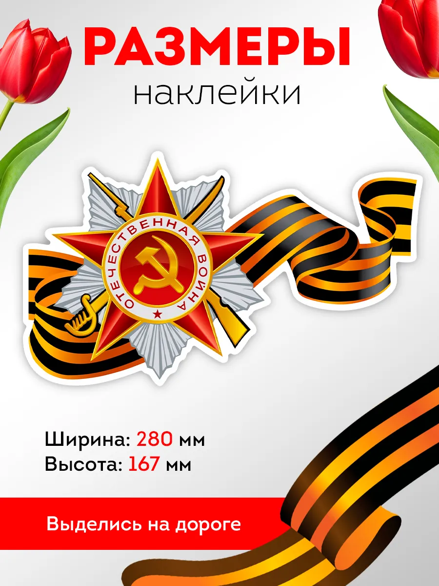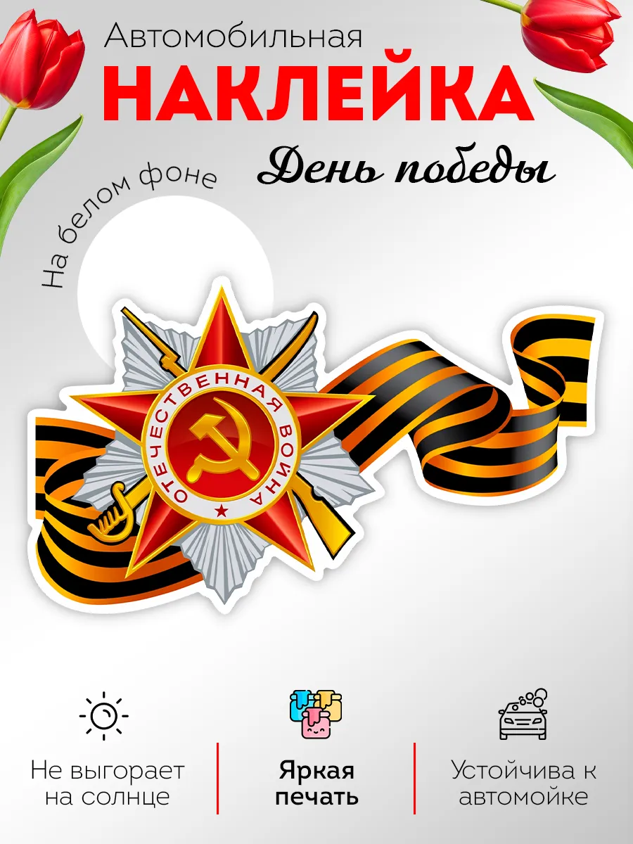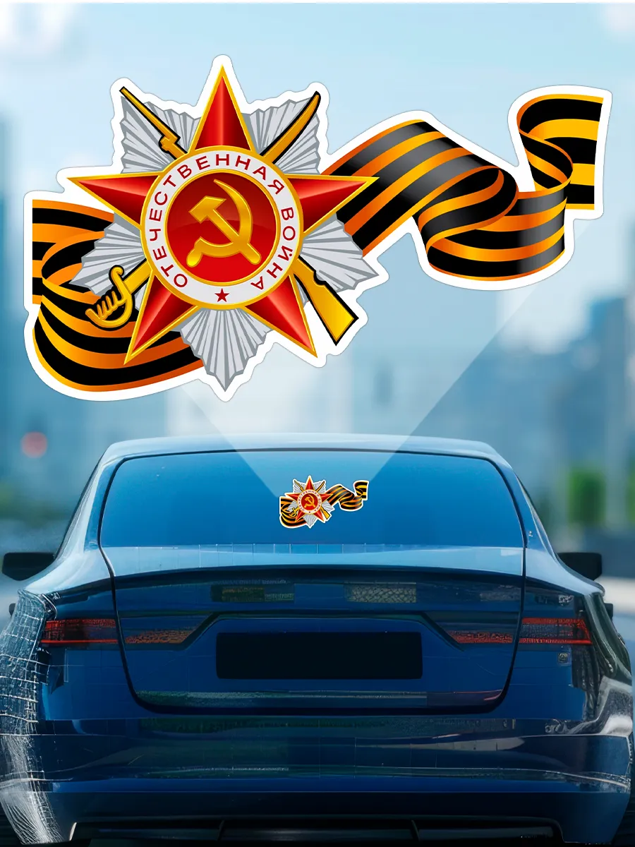Наклейка на автомобиль к празднику 9 Мая - стильное и яркое украшение для вашего железного коня! Стикер на автомобиль ко Дню Победы легко наклеить и демонтировать благодаря подробной инструкции, которая идет в комплекте. Такой аксессуар подчеркнет вашу гордость за героев.