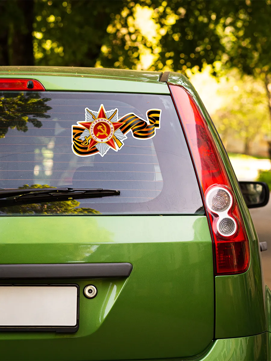 Патриотическая наклейка на авто c Орденом Отечественной войны и Георгиевская лента! к празднику 9 Мая – это отличный способ ярко и стильно украсить ваш автомобиль в честь Дня Великой Победы! Наклейка на авто С днем Победы Георгиевская лента.