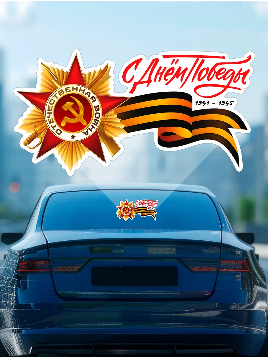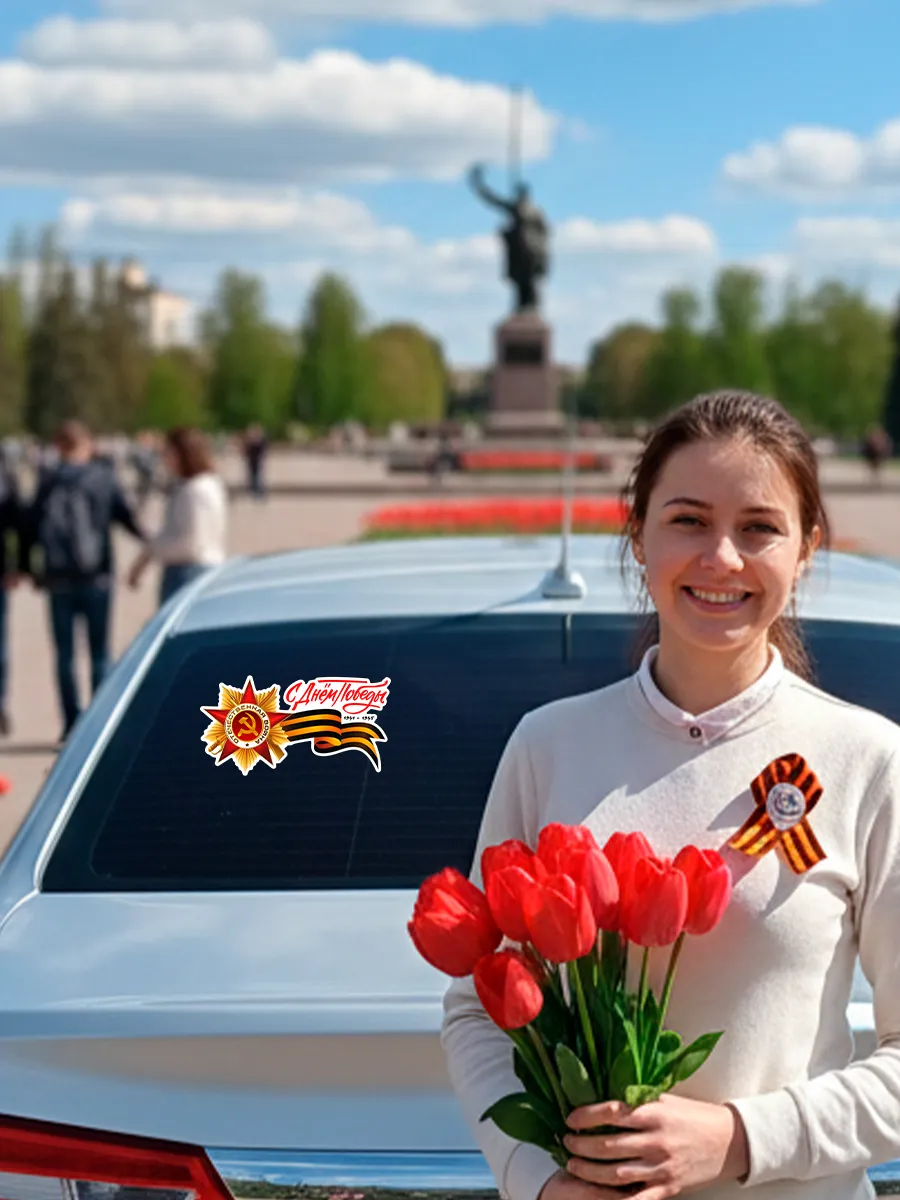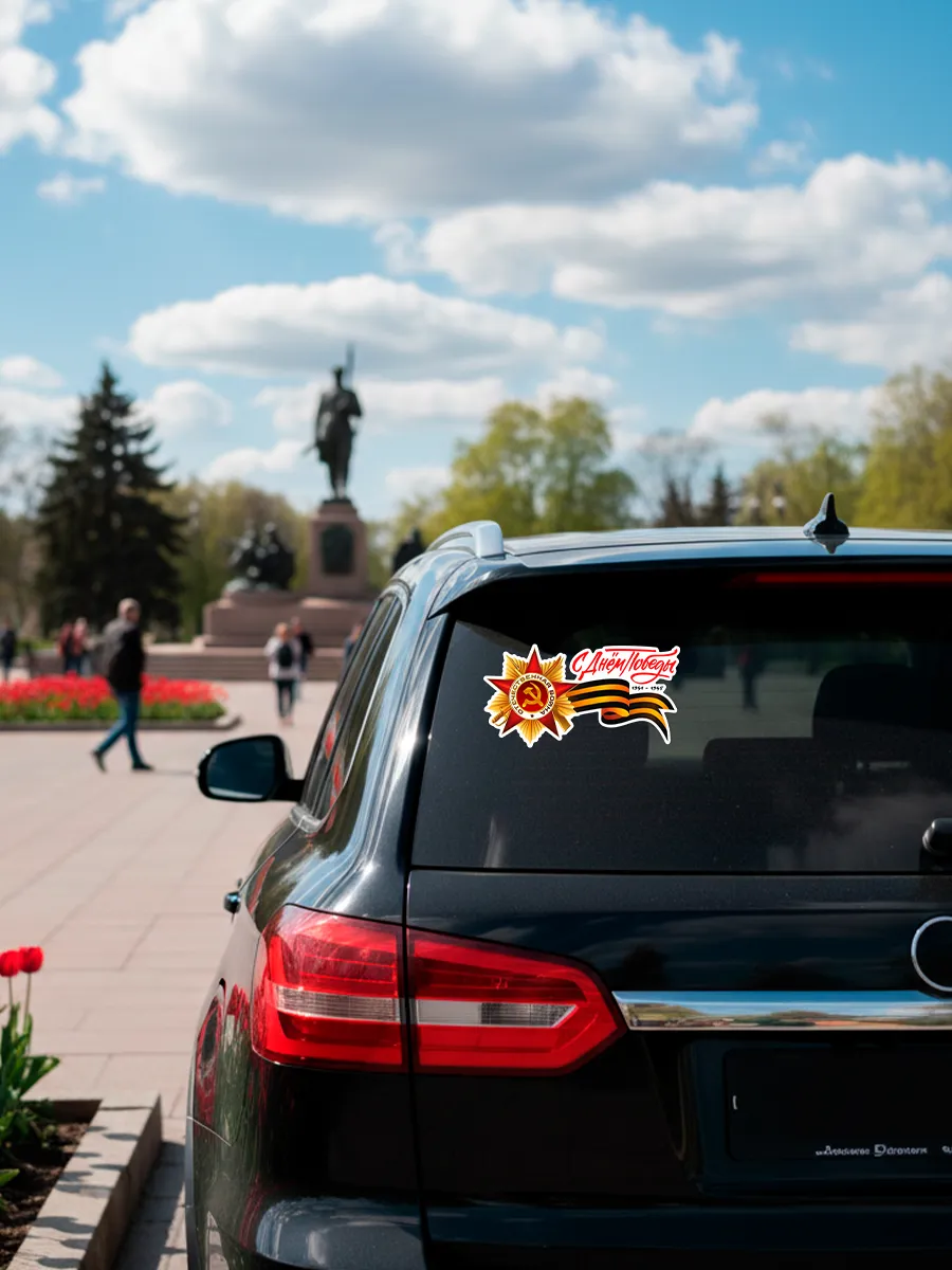 Наклейка на автомобиль к празднику 9 Мая - стильное и яркое украшение для вашего железного коня! Стикер на автомобиль ко Дню Победы легко наклеить и демонтировать благодаря подробной инструкции, которая идет в комплекте. Такой аксессуар подчеркнет вашу гордость за героев.