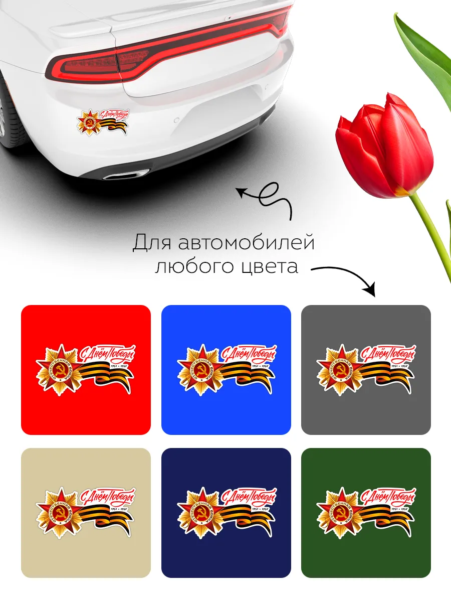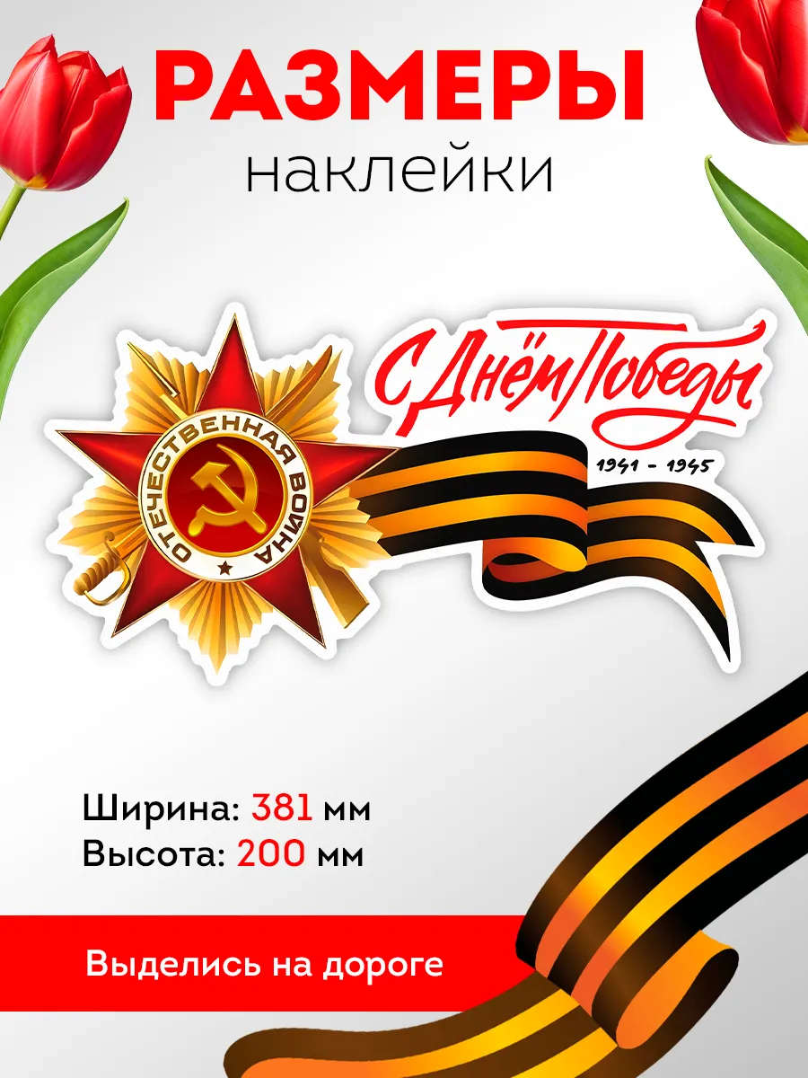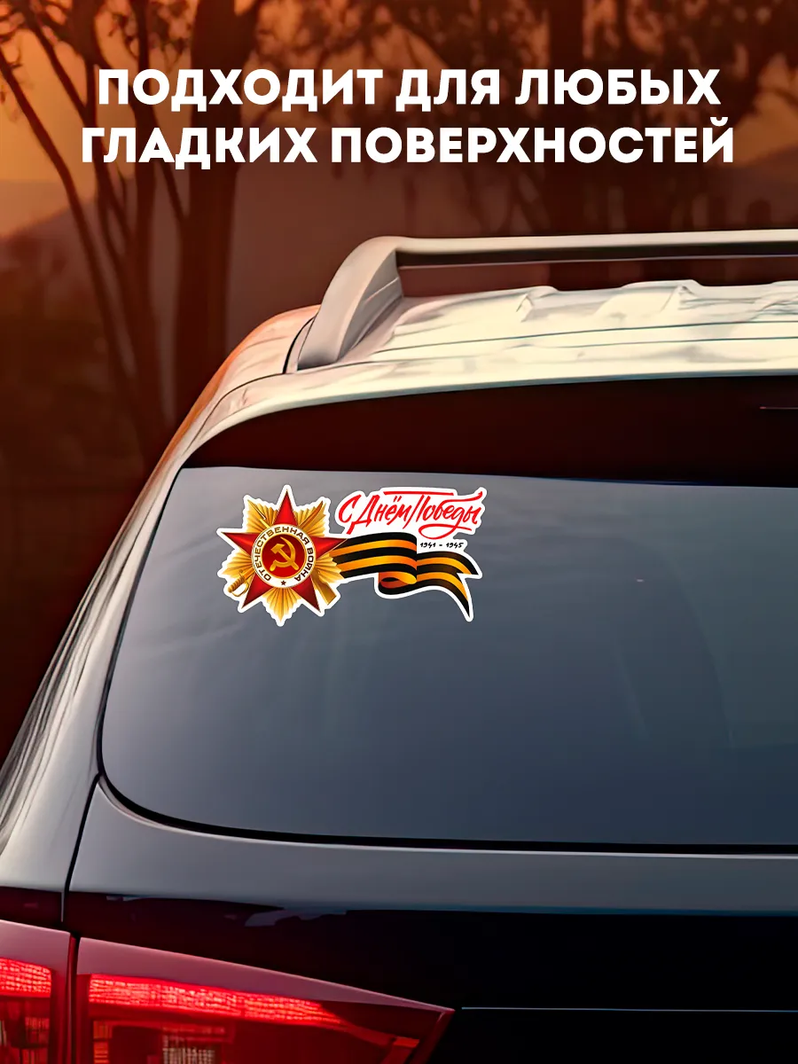 Наклейка на автомобиль к празднику 9 Мая - стильное и яркое украшение для вашего железного коня! Стикер на автомобиль ко Дню Победы легко наклеить и демонтировать благодаря подробной инструкции, которая идет в комплекте. Такой аксессуар подчеркнет вашу гордость за героев.