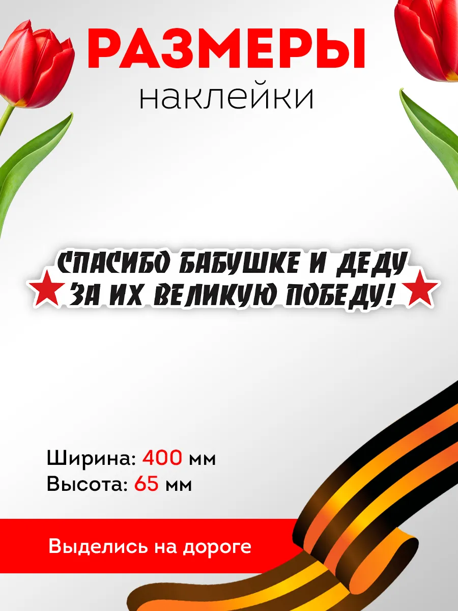 Патриотическая наклейка на авто Спасибо деду за Победу! К празднику 9 Мая – это отличный способ ярко и стильно украсить ваш автомобиль в честь Дня Победы! Этот яркий стикер на автомобиль ко Дню Победы поможет вам выразить свою гордость и уважение к своим предкам - героям. Наклейку можно нанести на стекло или кузов автомобиля, она напечатана на качественной виниловой белой пленке, вырезана по контуру.