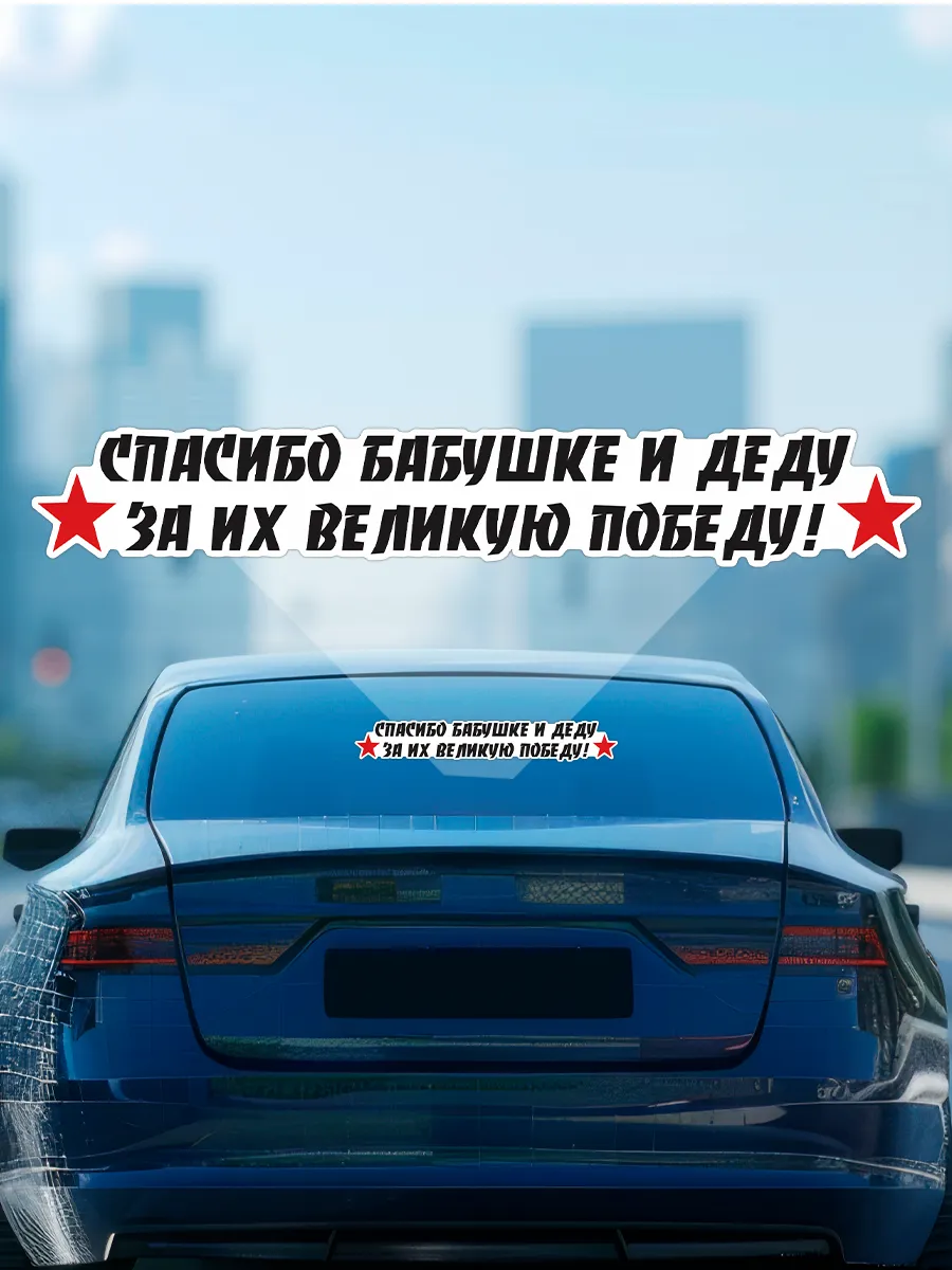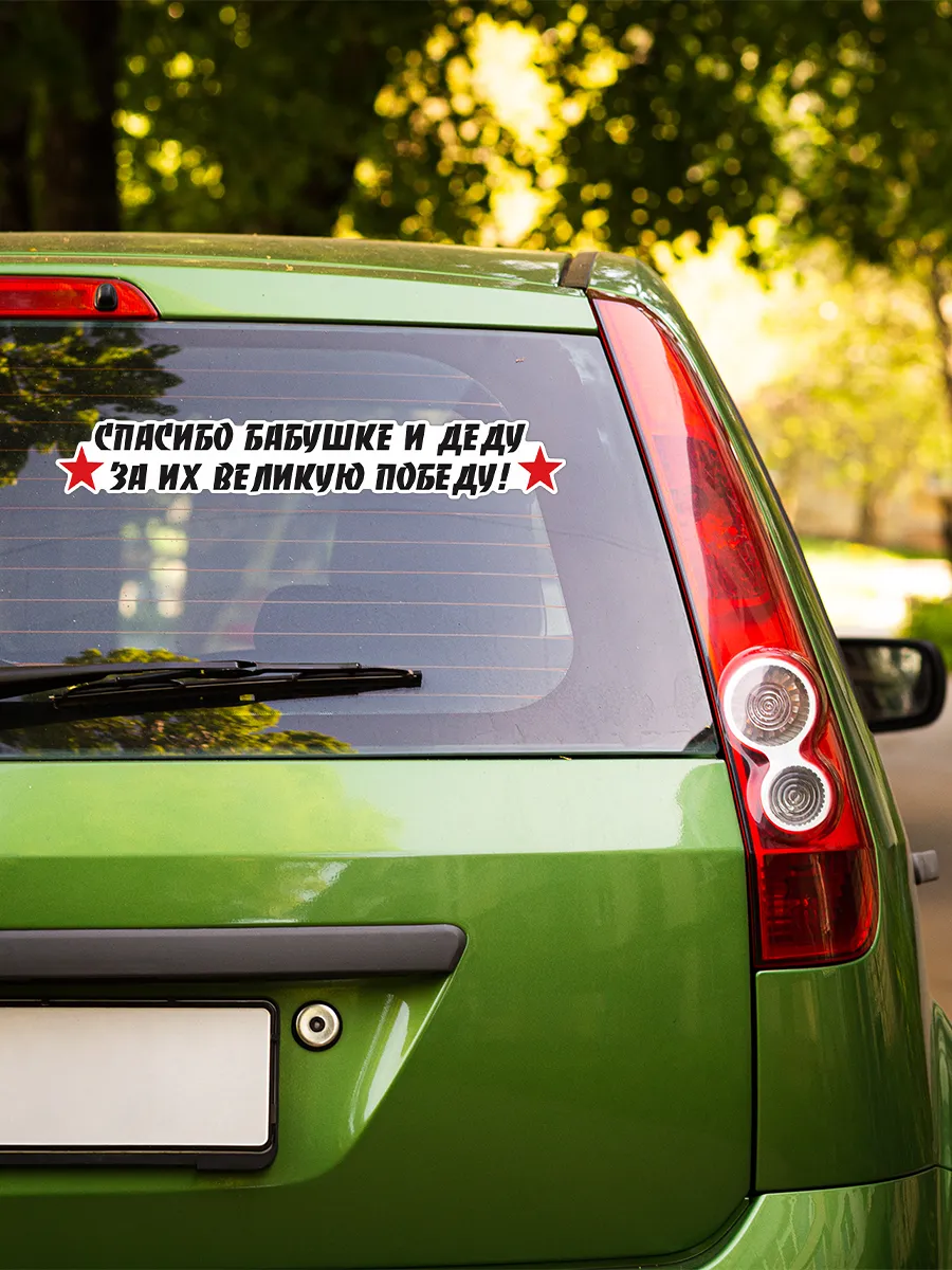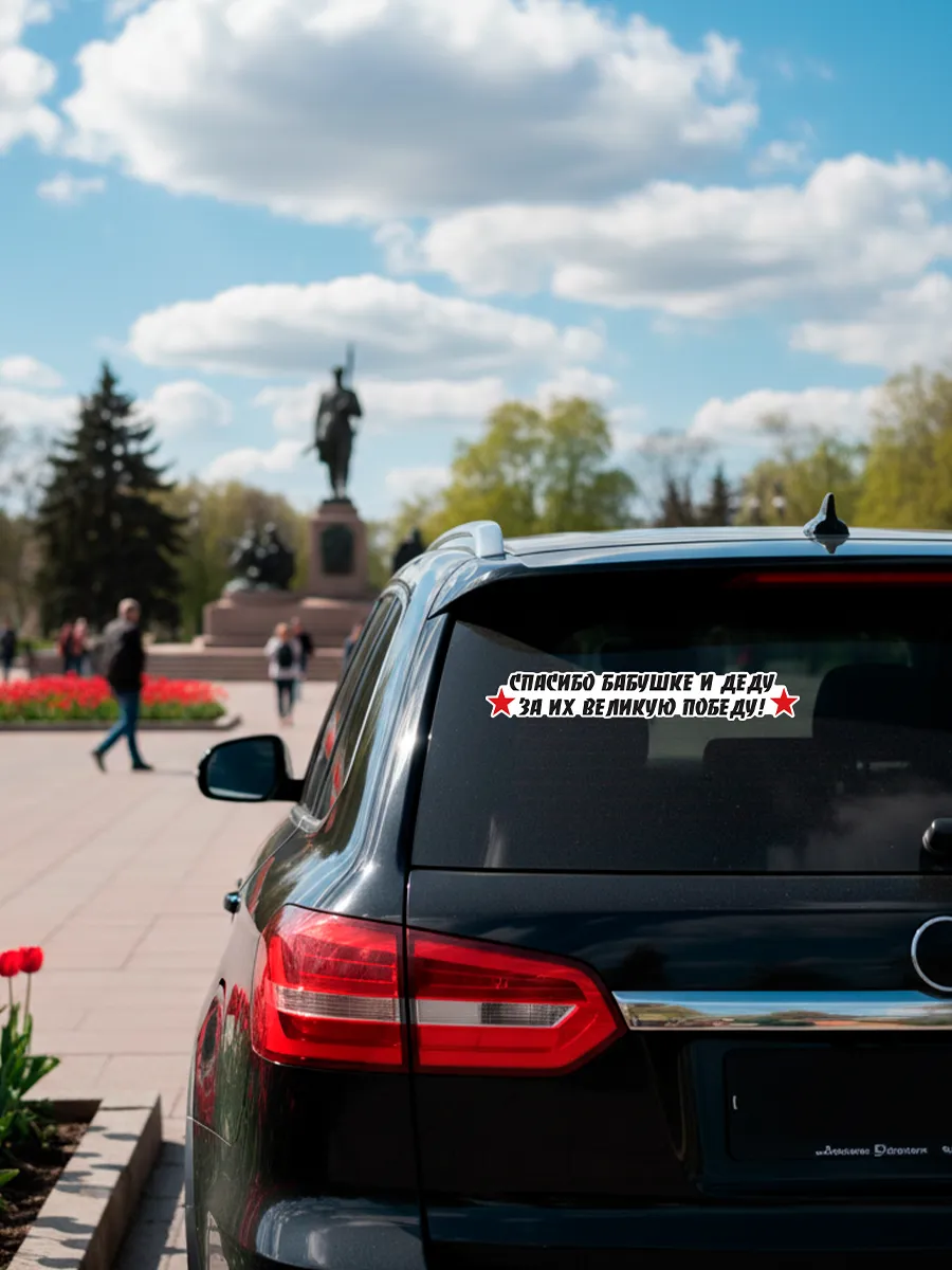 Стильный тюнинг к празднику Победы с наклейкой на авто заднее стекло Спасибо за Победу! 9 Мая обязательно обратит на себя внимание других участников дорожного движения. Не упустите возможность украсить свой автомобиль к этому великому дню 9 мая! Для истинных патриотов совей Родины! Тираж ограничен!