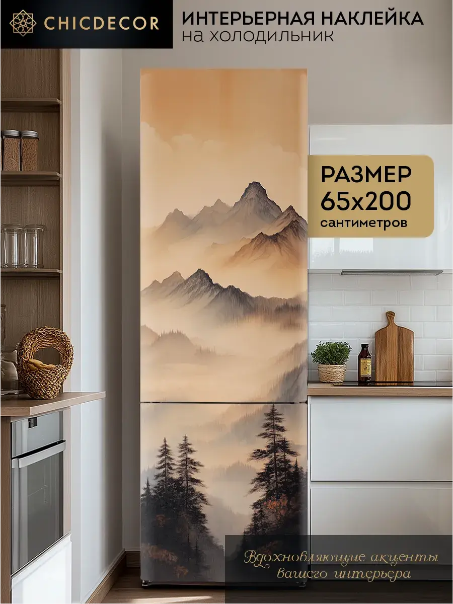 Наклейка на холодильник "Горы в бежевых тонах" от CHIC DECOR - это прекрасный способ добавить яркий акцент в интерьер вашей кухни. Большая и красочная наклейка в теплых тонах с изображением рисунка гор, елей и тумана станет настоящим украшением вашего холодильника, преобразив его в стильный элемент декора. Изготовленная из высококачественного плотного винила, наклейка проста в нанесении и удалении, не оставляя следов на поверхности.