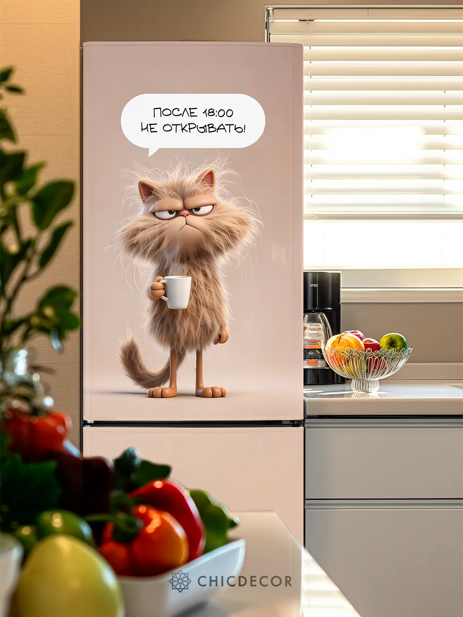 Наклейка подходит не только для холодильника, но и для декора стены, если необходимо оживить интерьер кухни или столовой. Влагостойкая поверхность позволяет использовать её в помещениях с высокой влажностью, сохраняя первозданный вид на долгое время. Прикольная наклейка совмещает практичность и стиль, создана для творческих людей, желающих внести в свой дом уют и индивидуальность. Простота ухода и прочность делают ее надёжным вариантом для регулярного использования, а самоклеящаяся технология позволяет быстро обновить внешний вид холодильника без дополнительных затрат.