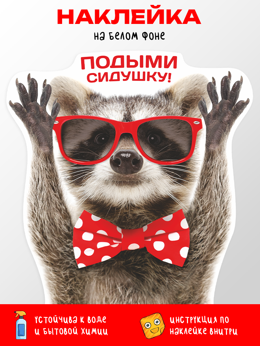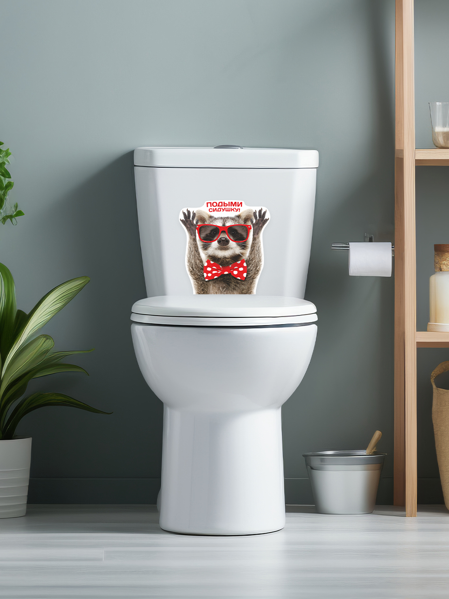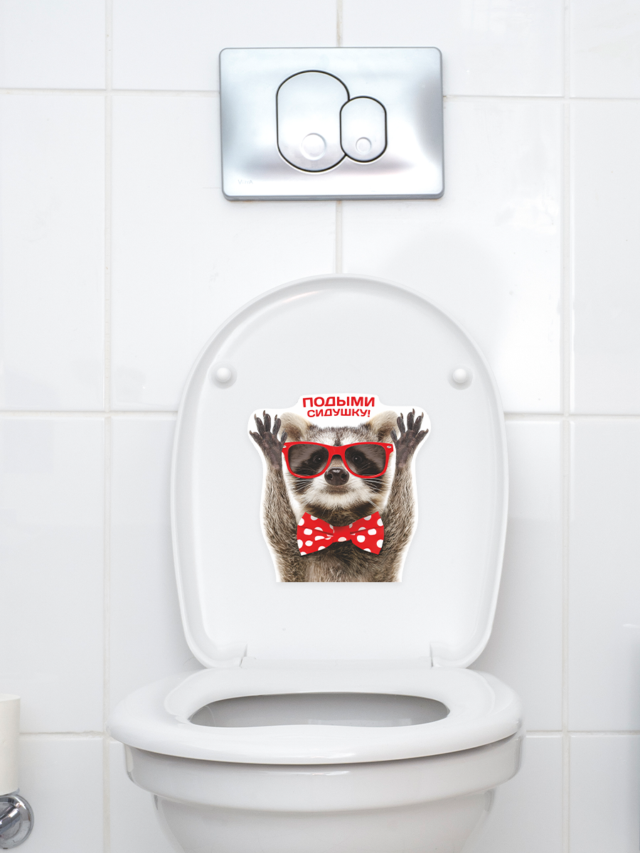 Интерьерная наклейка с енотом в красных очках и бабочкой добавят веселья и прикола в ваш домашний интерьер туалета. Веселый стикер с енотом и надписью "Подыми сидушку!" для домашнего декора, инструкция в комплекте. Можно нанести на любую гладкую поверхность: на стены, плитку, бачок или крышку унитаза.