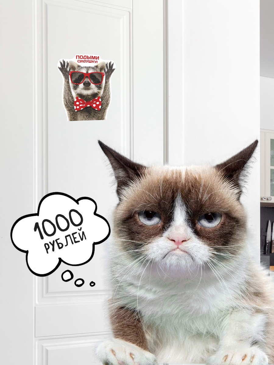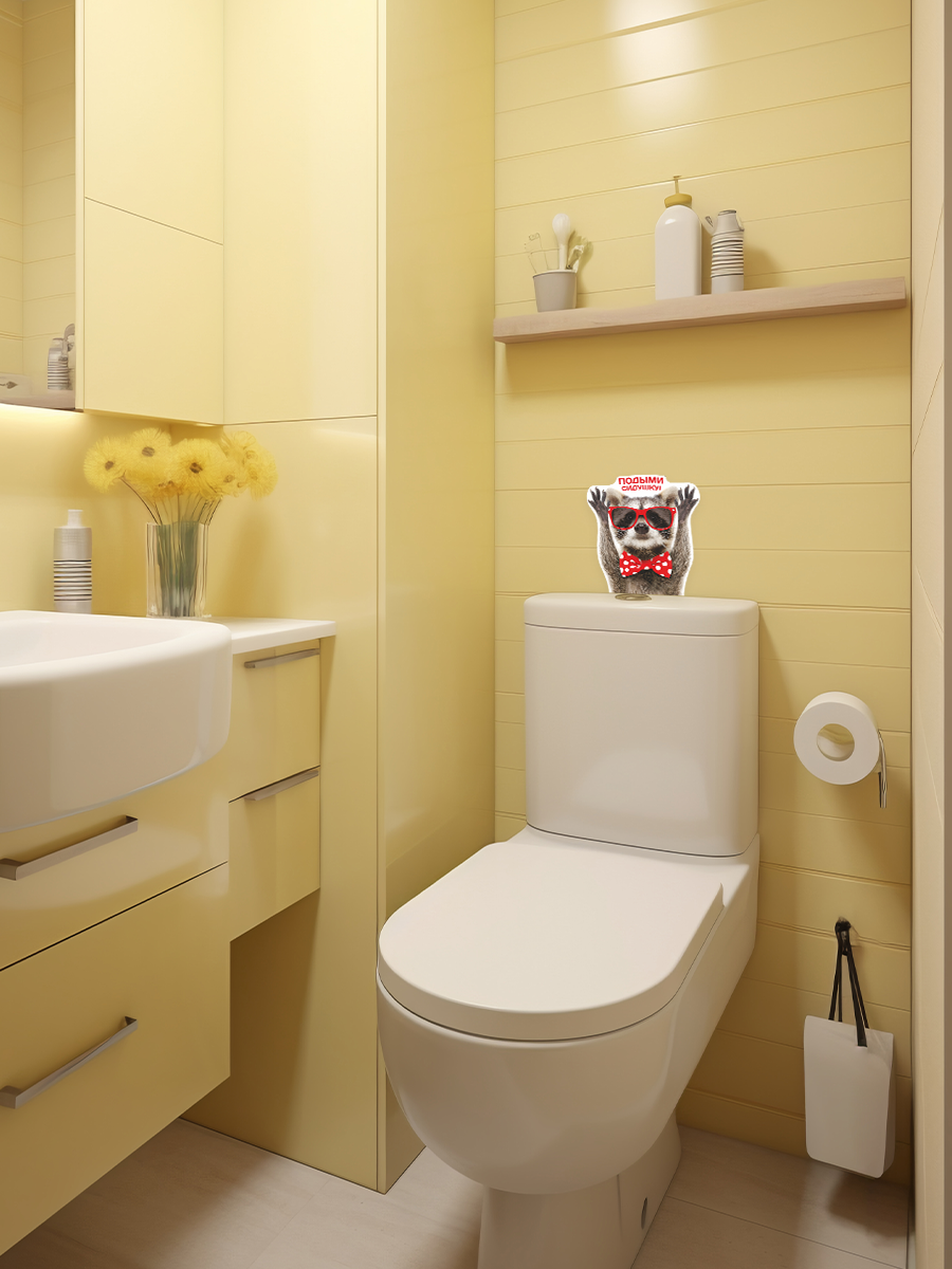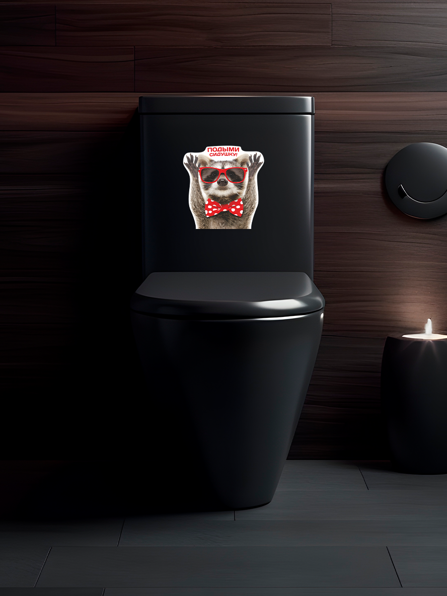 Интерьерная наклейка с енотом в красных очках и бабочкой добавят веселья и прикола в ваш домашний интерьер туалета. Веселый стикер с енотом и надписью "Подыми сидушку!" для домашнего декора, инструкция в комплекте. Можно нанести на любую гладкую поверхность: на стены, плитку, бачок или крышку унитаза.