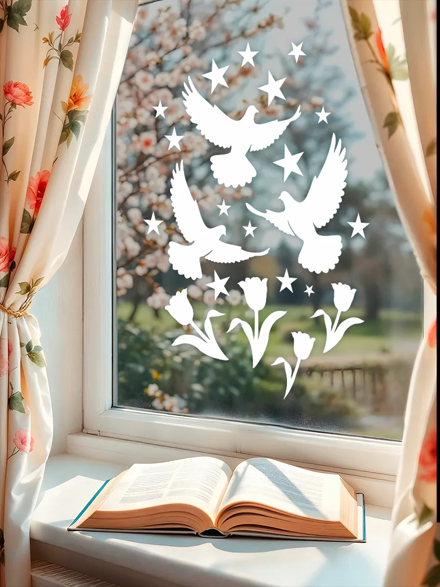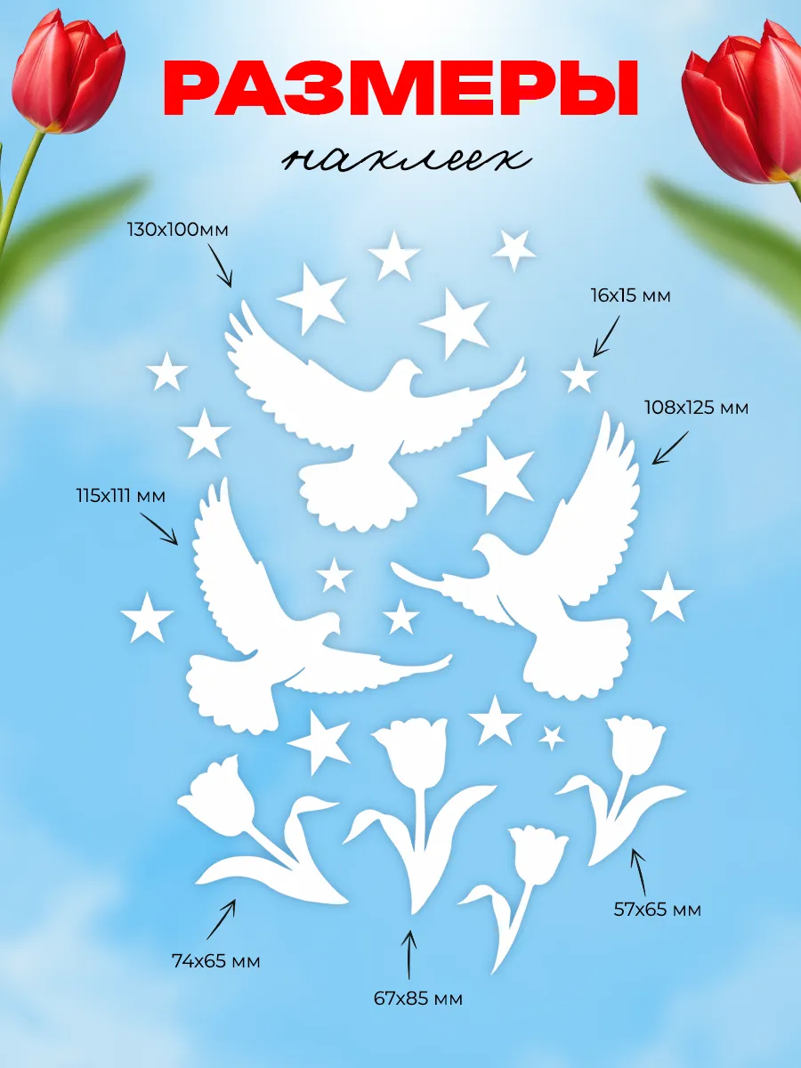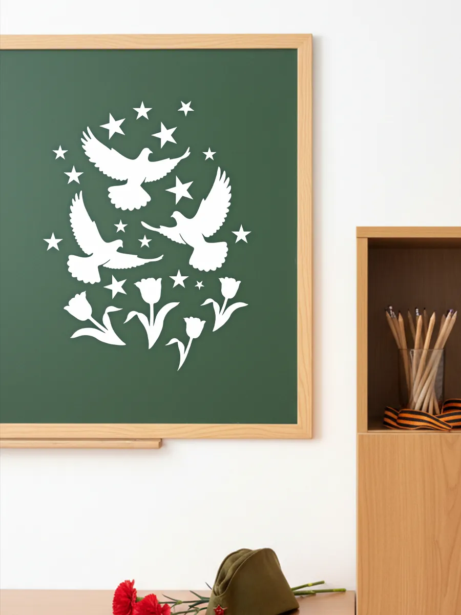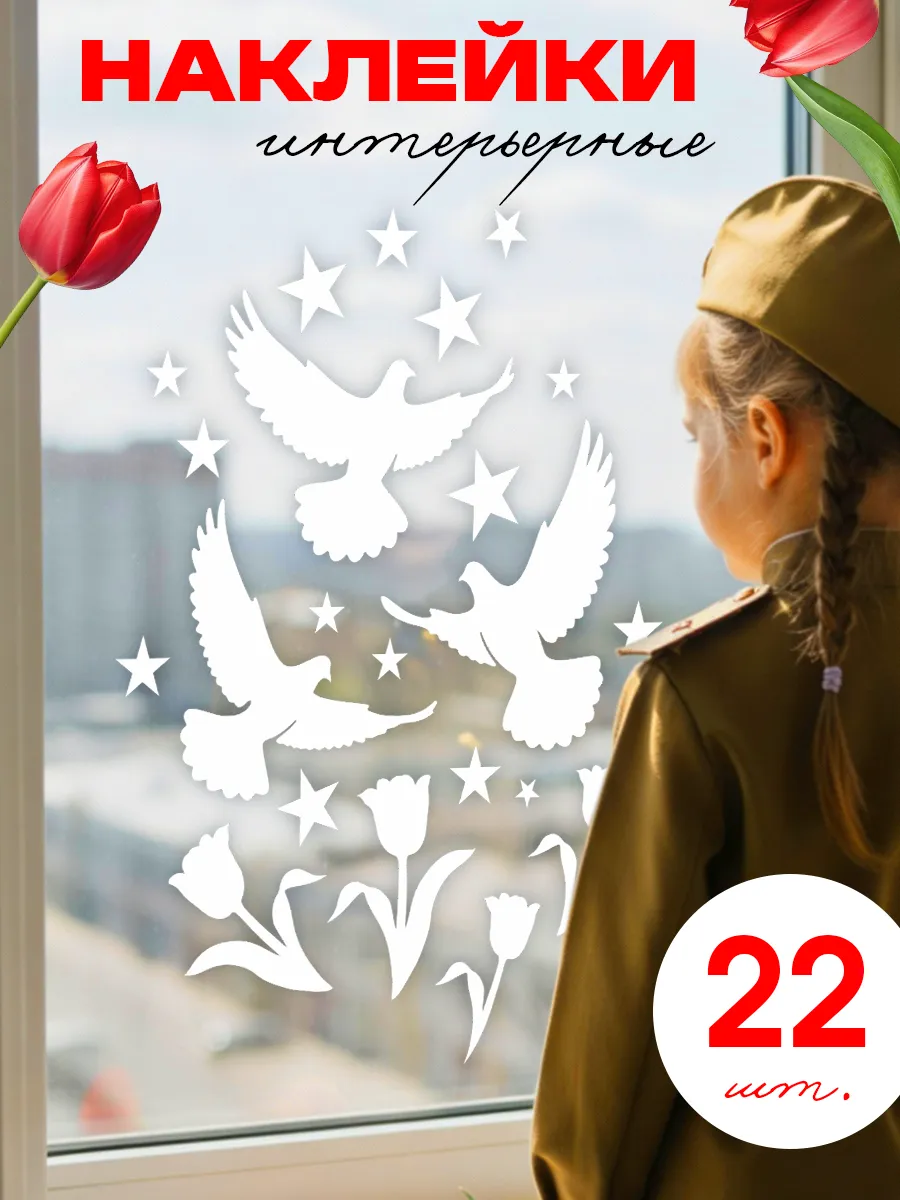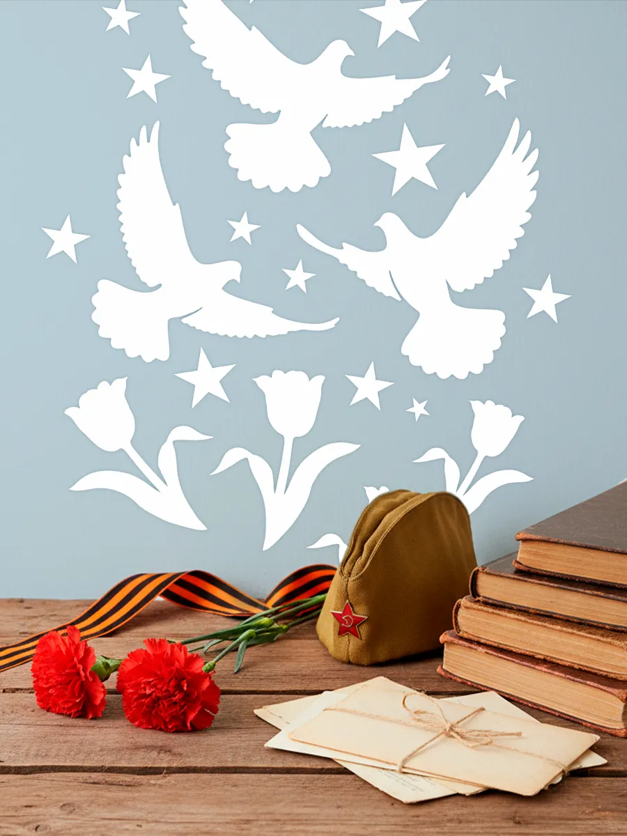 Интерьерные наклейки к 9 мая для праздничного оформления: подходят на окна, стену и зеркало. Тематика Дня Победы — голуби, звезды и символика победы — помогает быстро создать выразительный декор для дома, школы, детского сада и групп. Набор наклеек рассчитан на оформление к 9 мая без сложного монтажа: элементы легко переносятся, ровно ложатся на гладкие поверхности и аккуратно снимаются после мая, не повреждая основание при корректном использовании.