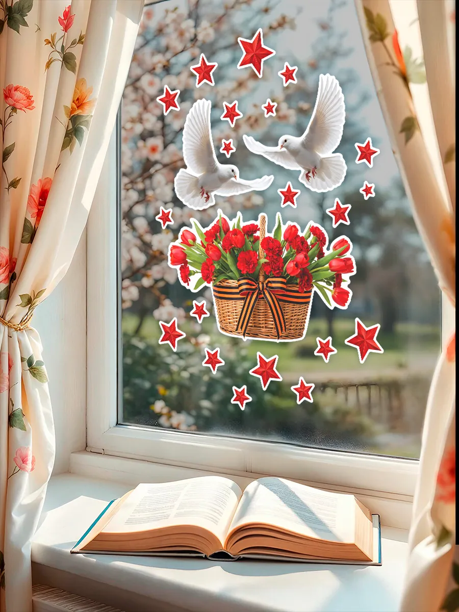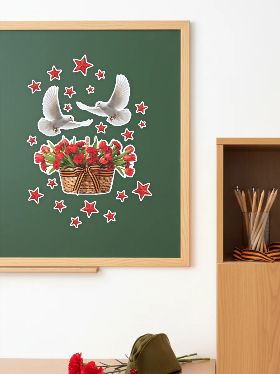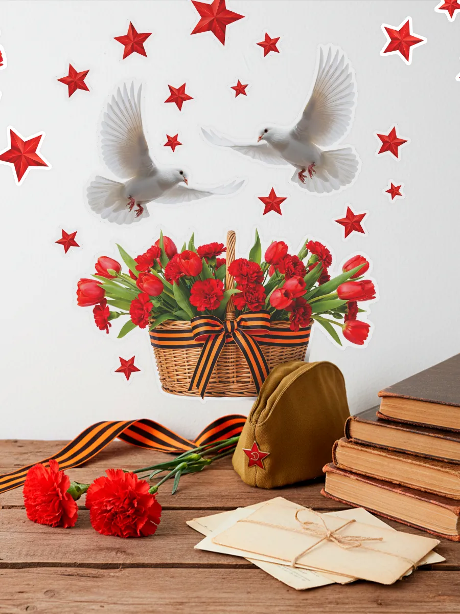 Интерьерные наклейки к 9 мая для праздничного оформления: подходят на окна, стену и зеркало. Тематика Дня Победы — голуби, звезды и символика победы — помогает быстро создать выразительный декор для дома, школы, детского сада и групп. Набор наклеек рассчитан на оформление к 9 мая без сложного монтажа: элементы легко переносятся, ровно ложатся на гладкие поверхности и аккуратно снимаются после мая, не повреждая основание при корректном использовании.