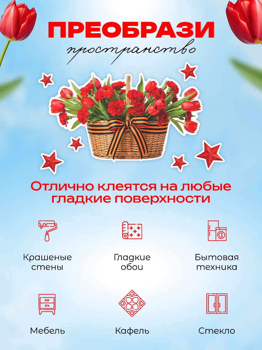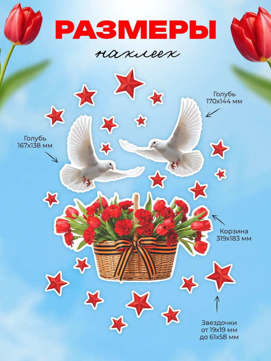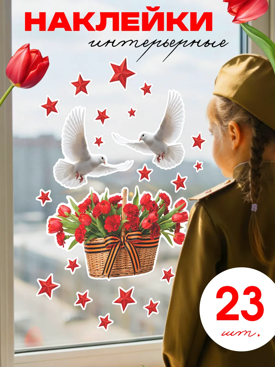 Интерьерные наклейки к 9 мая для праздничного оформления: подходят на окна, стену и зеркало. Тематика Дня Победы — голуби, звезды и символика победы — помогает быстро создать выразительный декор для дома, школы, детского сада и групп. Набор наклеек рассчитан на оформление к 9 мая без сложного монтажа: элементы легко переносятся, ровно ложатся на гладкие поверхности и аккуратно снимаются после мая, не повреждая основание при корректном использовании.