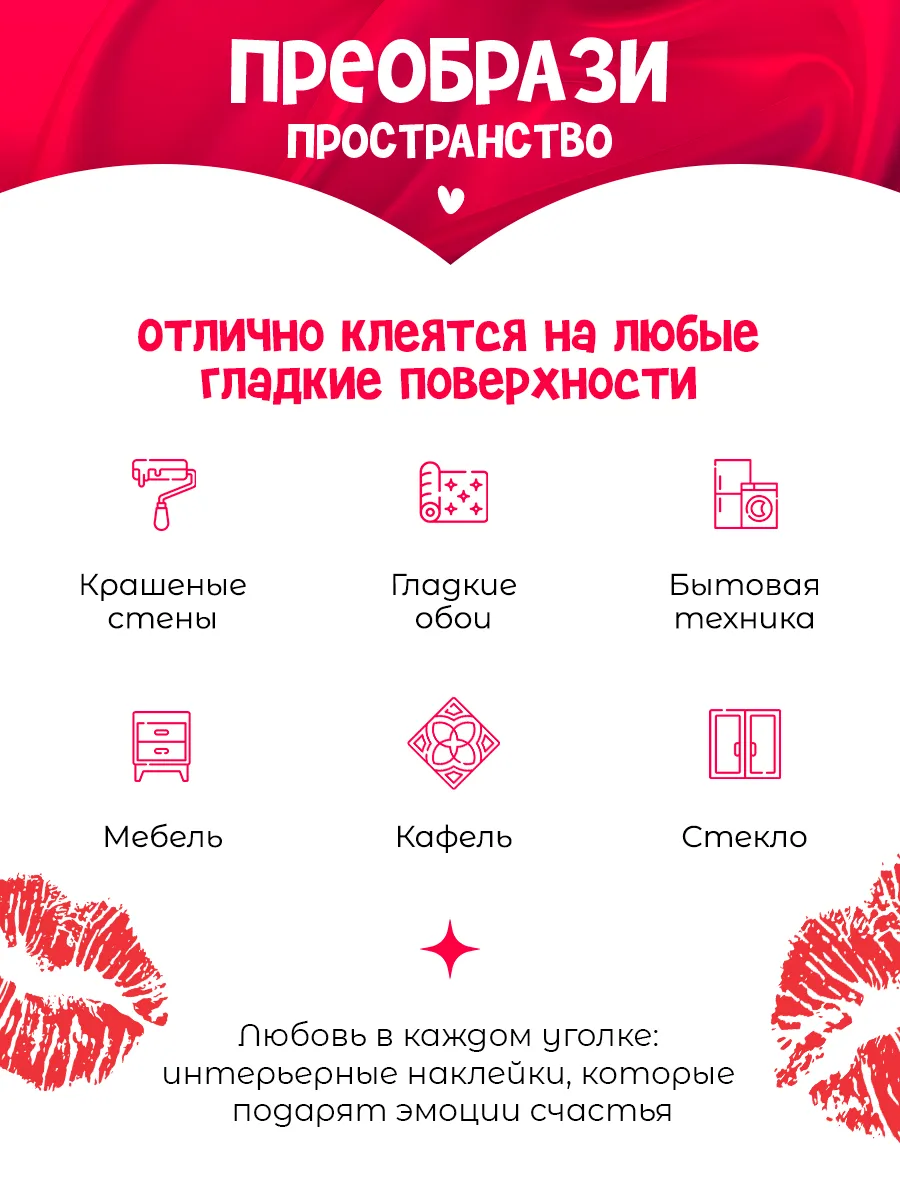 Набор интерьерных наклеек включает милые стикеров в форме сердечек, идеально подходящих для декора стен в детской комнате или спальне. Эти самоклеящиеся наклейки-валентинки отлично заменят традиционные способы украшения, что позволяет быстро обновить интерьер без необходимости перекраски или переклеивания обоев. Влагостойкие материалы обеспечивают долговечность на любых поверхностях, включая плитку, мебель, двери и даже холодильник.