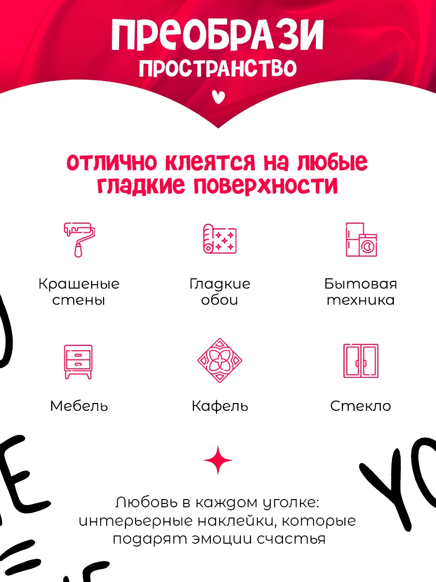 Набор интерьерных наклеек включает милые стикеров в форме сердечек, идеально подходящих для декора стен в детской комнате или спальне. Эти самоклеящиеся наклейки-валентинки отлично заменят традиционные способы украшения, что позволяет быстро обновить интерьер без необходимости перекраски или переклеивания обоев. Влагостойкие материалы обеспечивают долговечность на любых поверхностях, включая плитку, мебель, двери и даже холодильник.