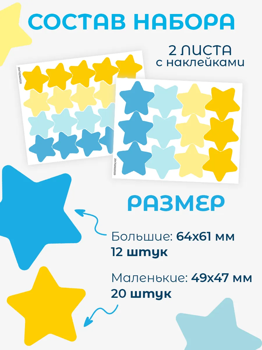 Добавьте уникальности в детскую комнату вашего ребёнка с помощью интерьерных наклеек-звездочек. Наши интерьерные наклейки помогут создать уютный уголок для игр и отдыха, внося в детскую атмосферу веселья и фантазии. Самоклеящиеся наклейки легко крепятся на стену, преобразуя комнату в чудесный домик для вашего маленького сокровища.