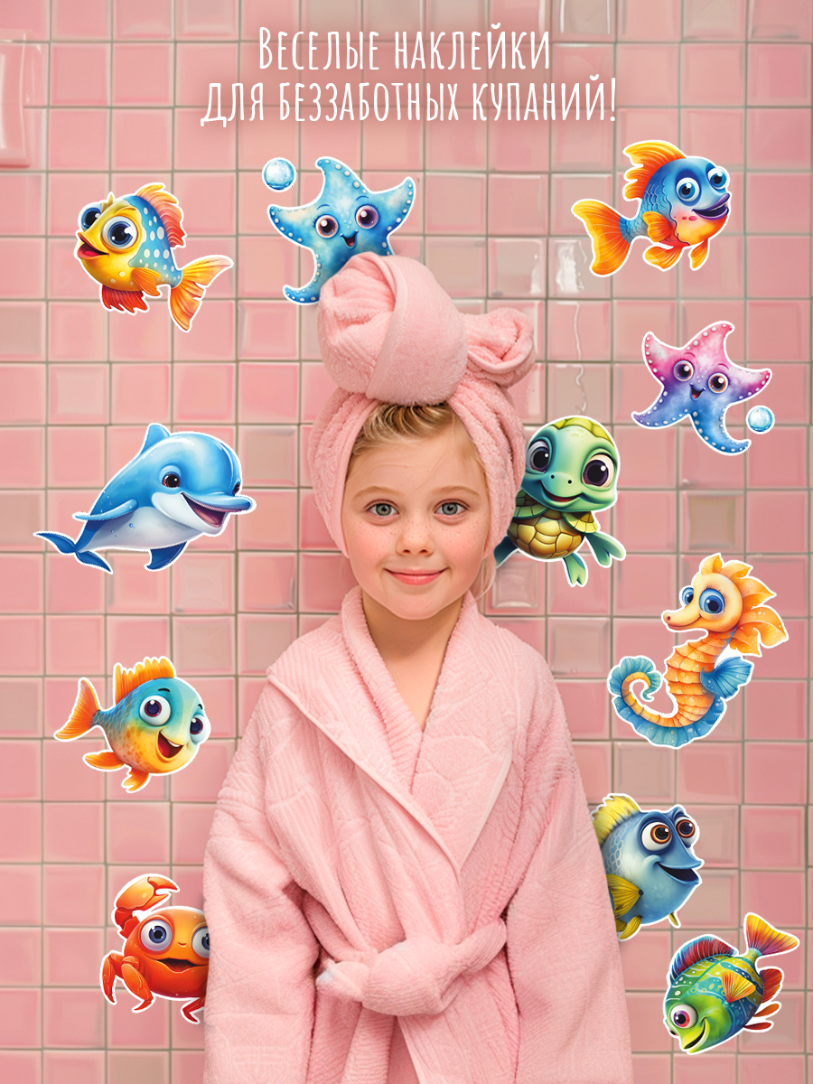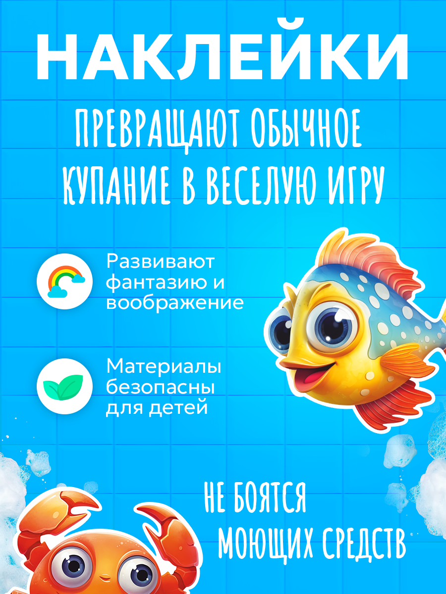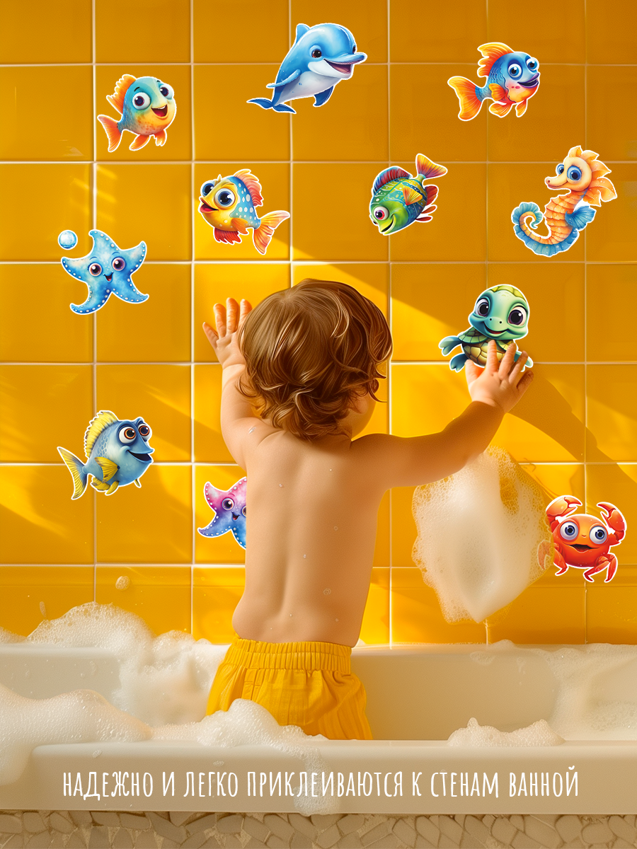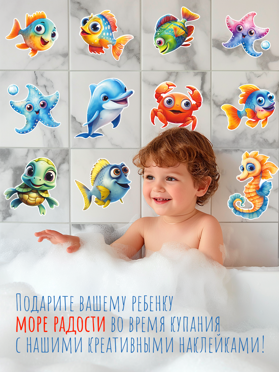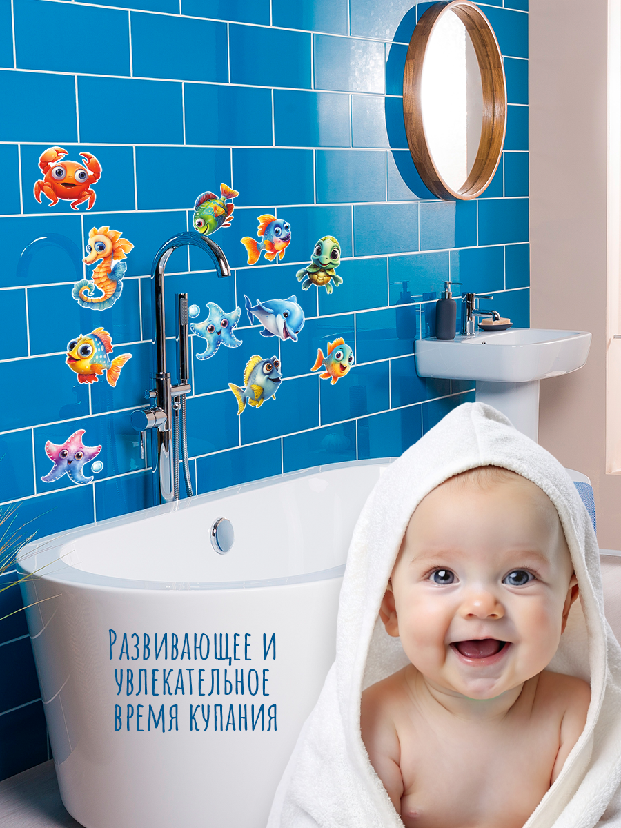 Когда в доме есть ребенок, набор наклеек “Морские обитатели” - это стильное и яркое решение для декора вашего дома. Разнообразные милые морские существа: забавные рыбки, морской конек, веселые морские звезды, дельфины и крабики, всего 11 персонажей из мультфильмов создают прекрасное настроение во время купания вашего малыша.