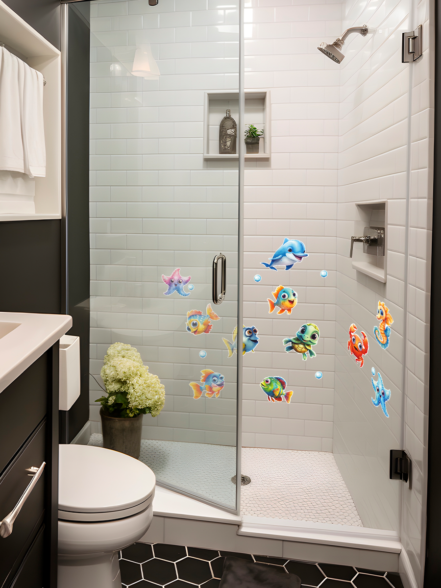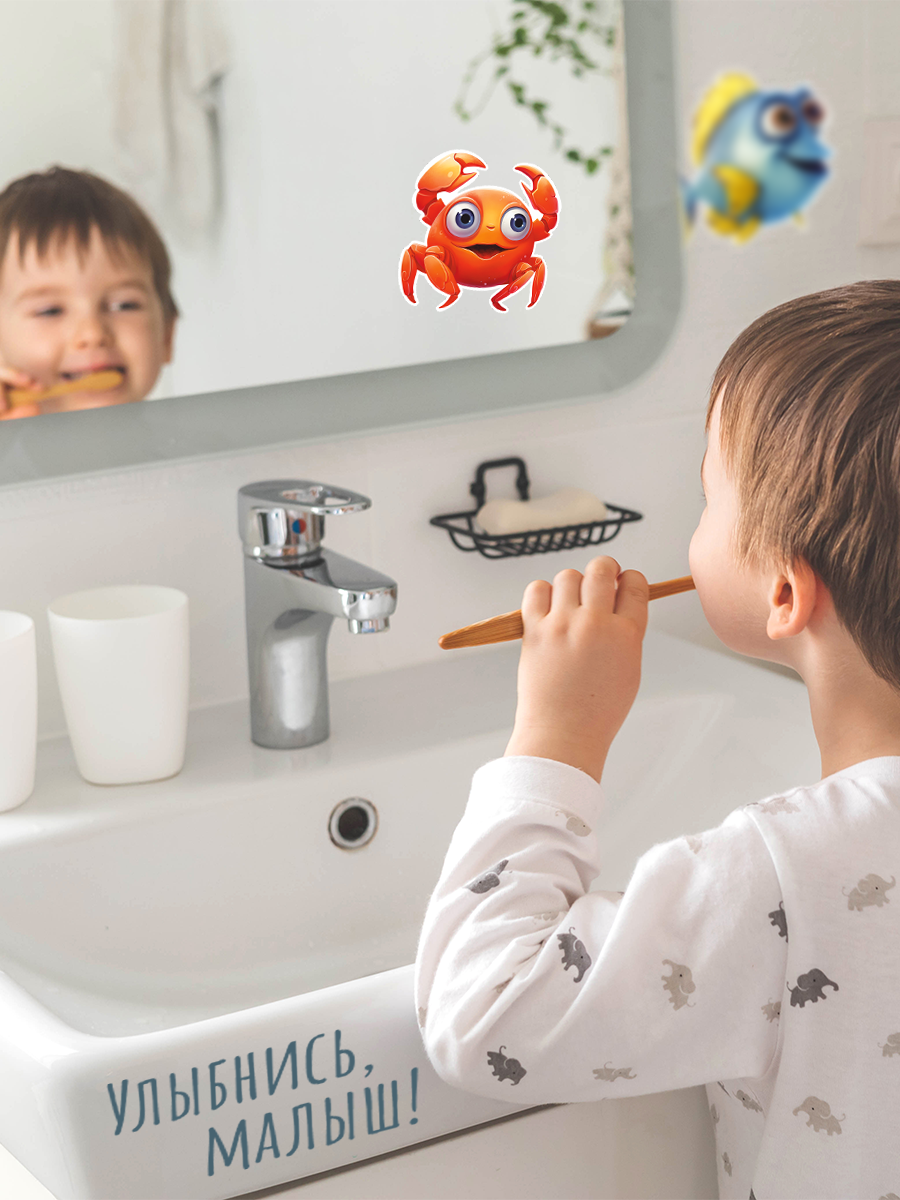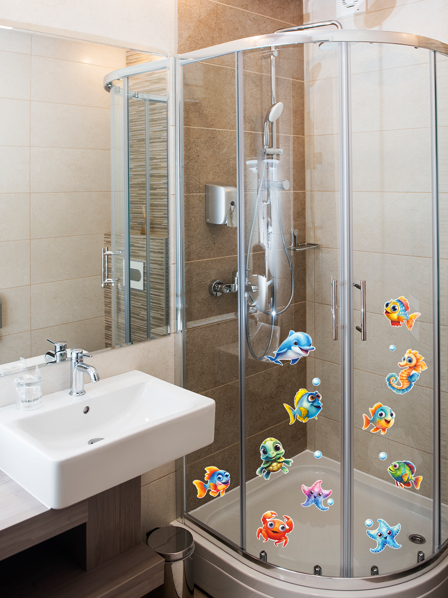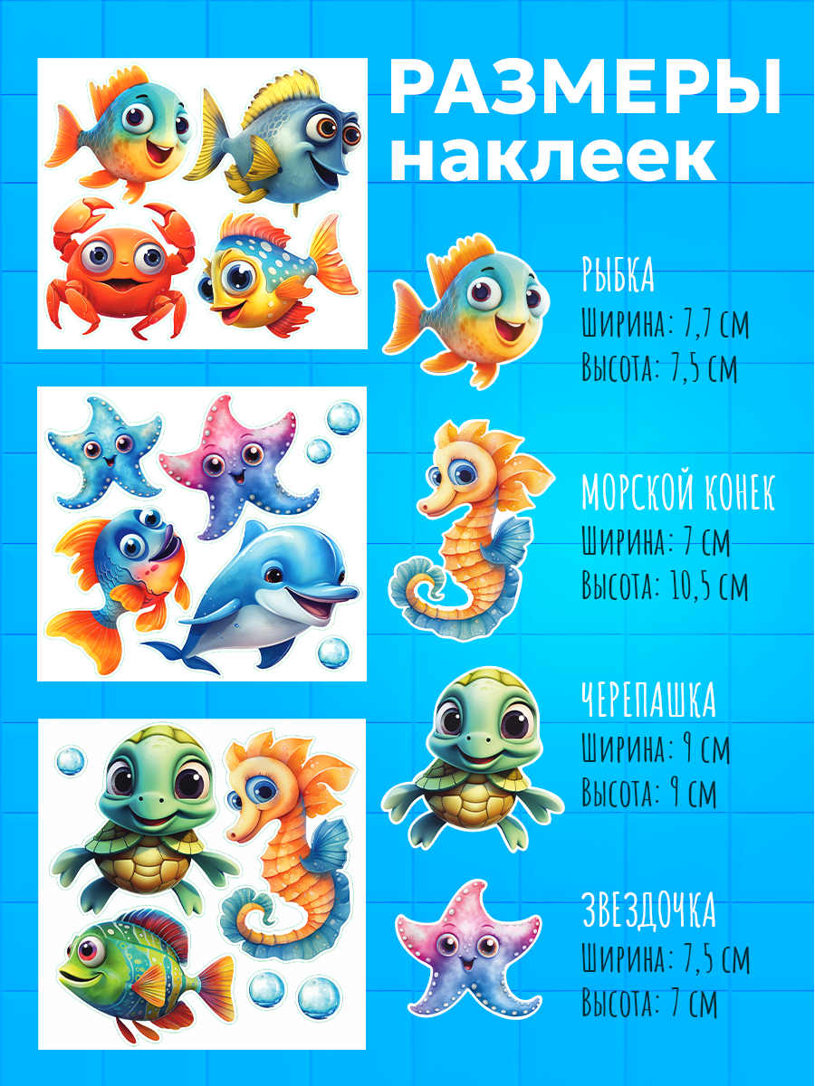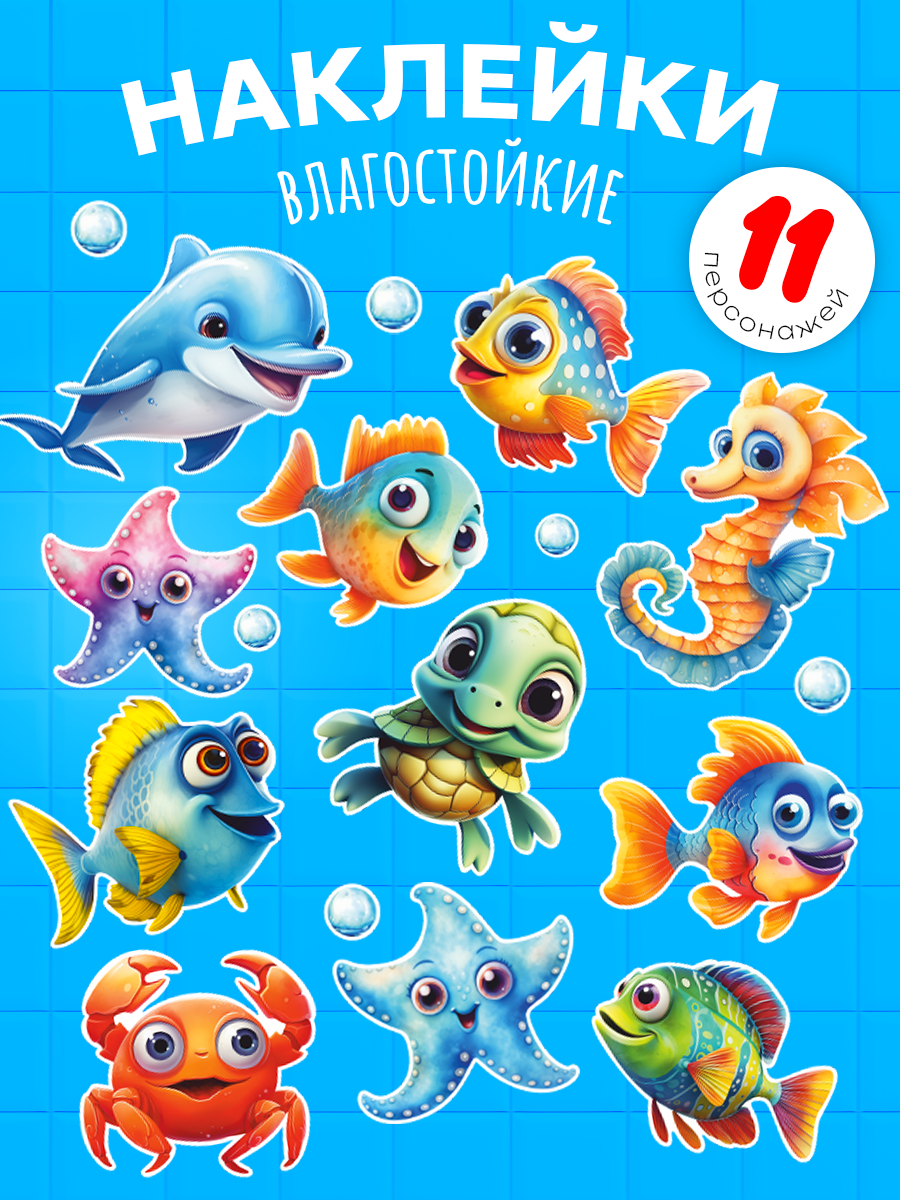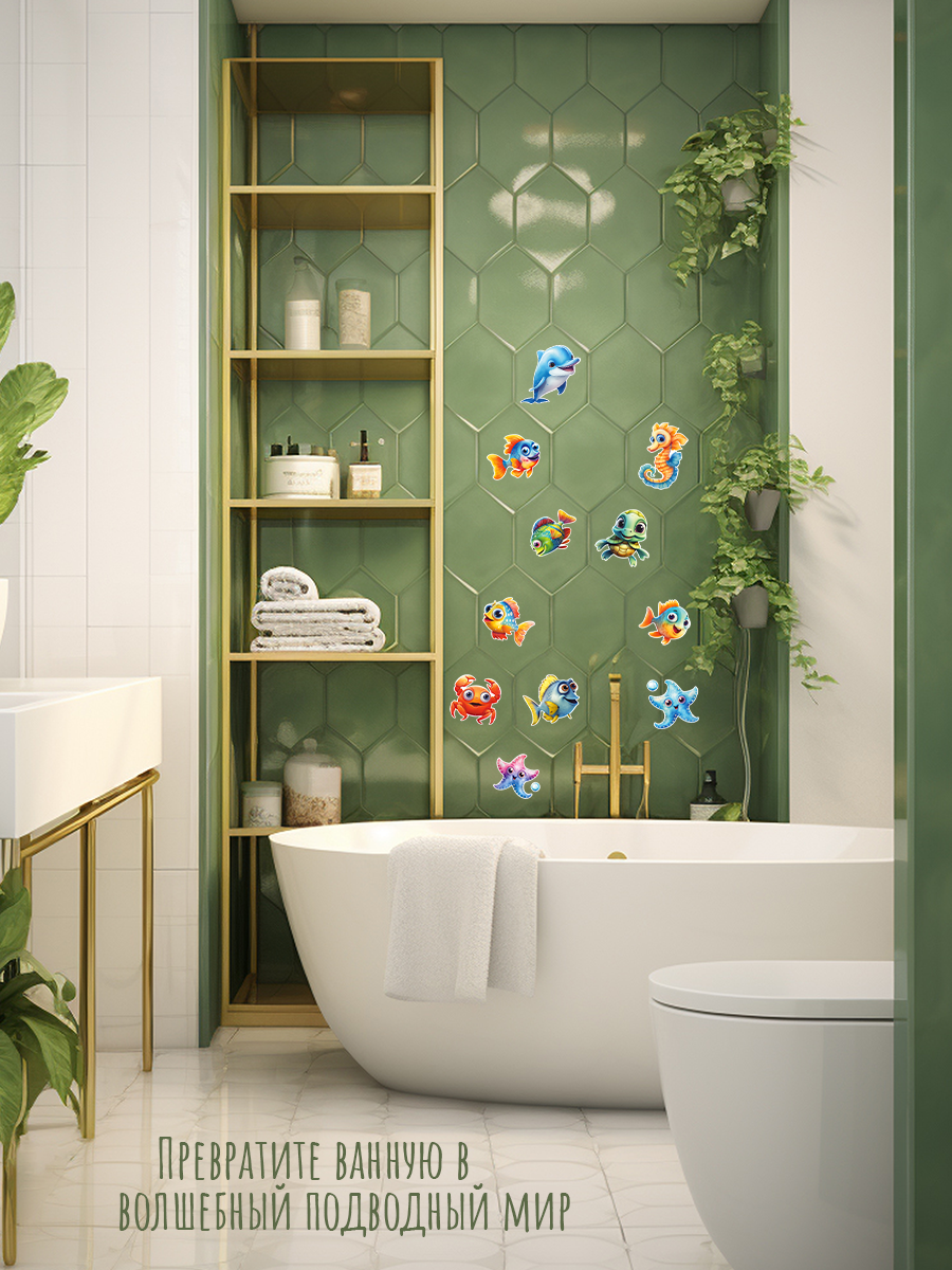 Когда в доме есть ребенок, набор наклеек “Морские обитатели” - это стильное и яркое решение для декора вашего дома. Разнообразные милые морские существа: забавные рыбки, морской конек, веселые морские звезды, дельфины и крабики, всего 11 персонажей из мультфильмов создают прекрасное настроение во время купания вашего малыша.