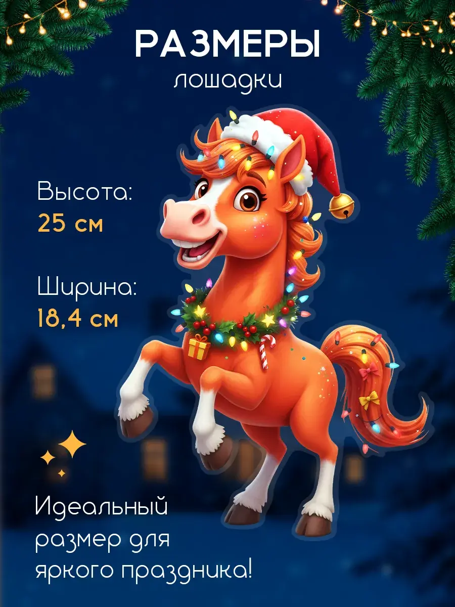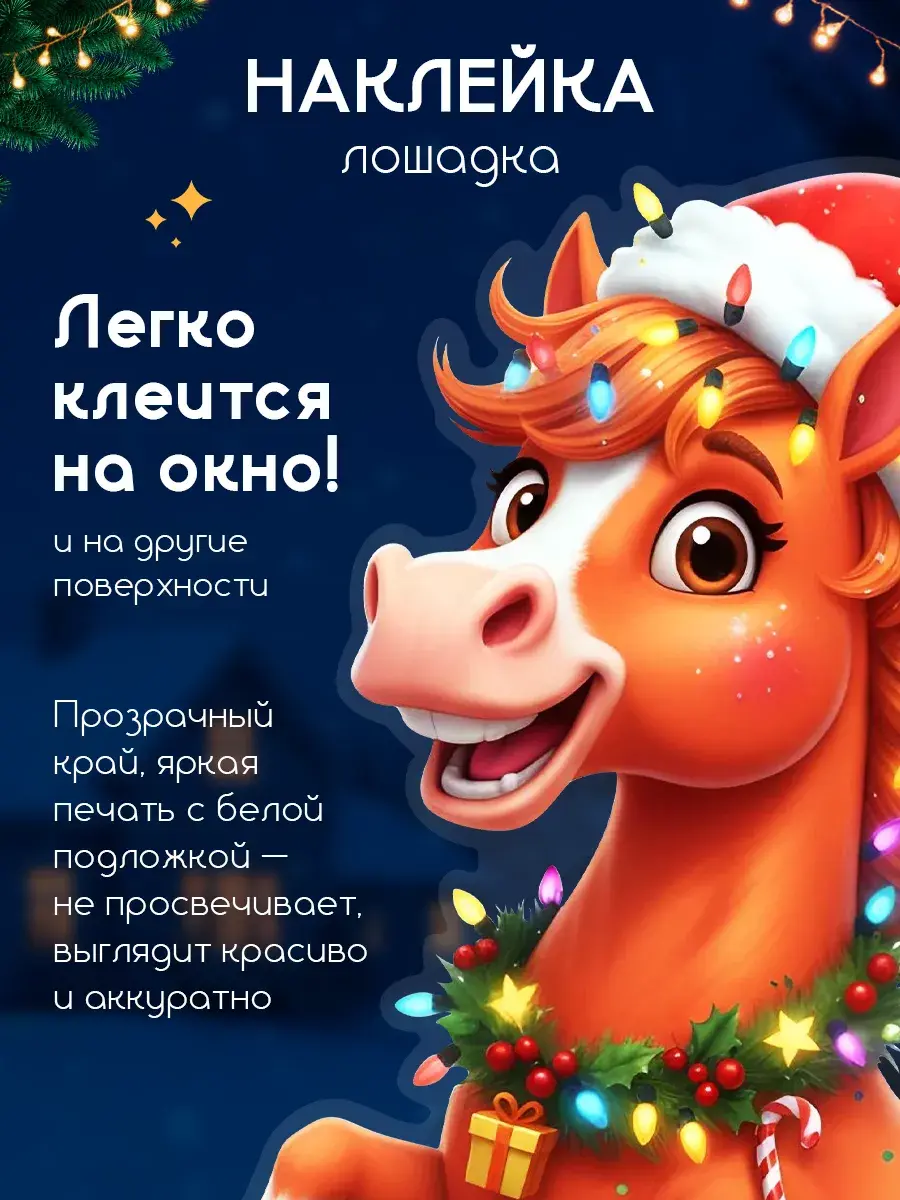 Наши новогодние наклейки отличаются высокой детализацией и качеством. Праздничный декор в виде лошадей может украсить не только окна, но и двери, обои или любую другую поверхность. Эти украшения идеально подойдут для встречи Нового года 2026.