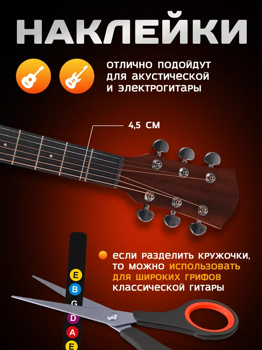 Наклейки могут использоваться на шестиструнных инструментах разной ширины. Если гриф классической гитары шире 4,5 сантиметров, стикер можно разделить на две части. При необходимости наклейки можно легко удалить, не оставив следов на гитаре. Прекрасный подарок для увлеченных игрой на гитаре!