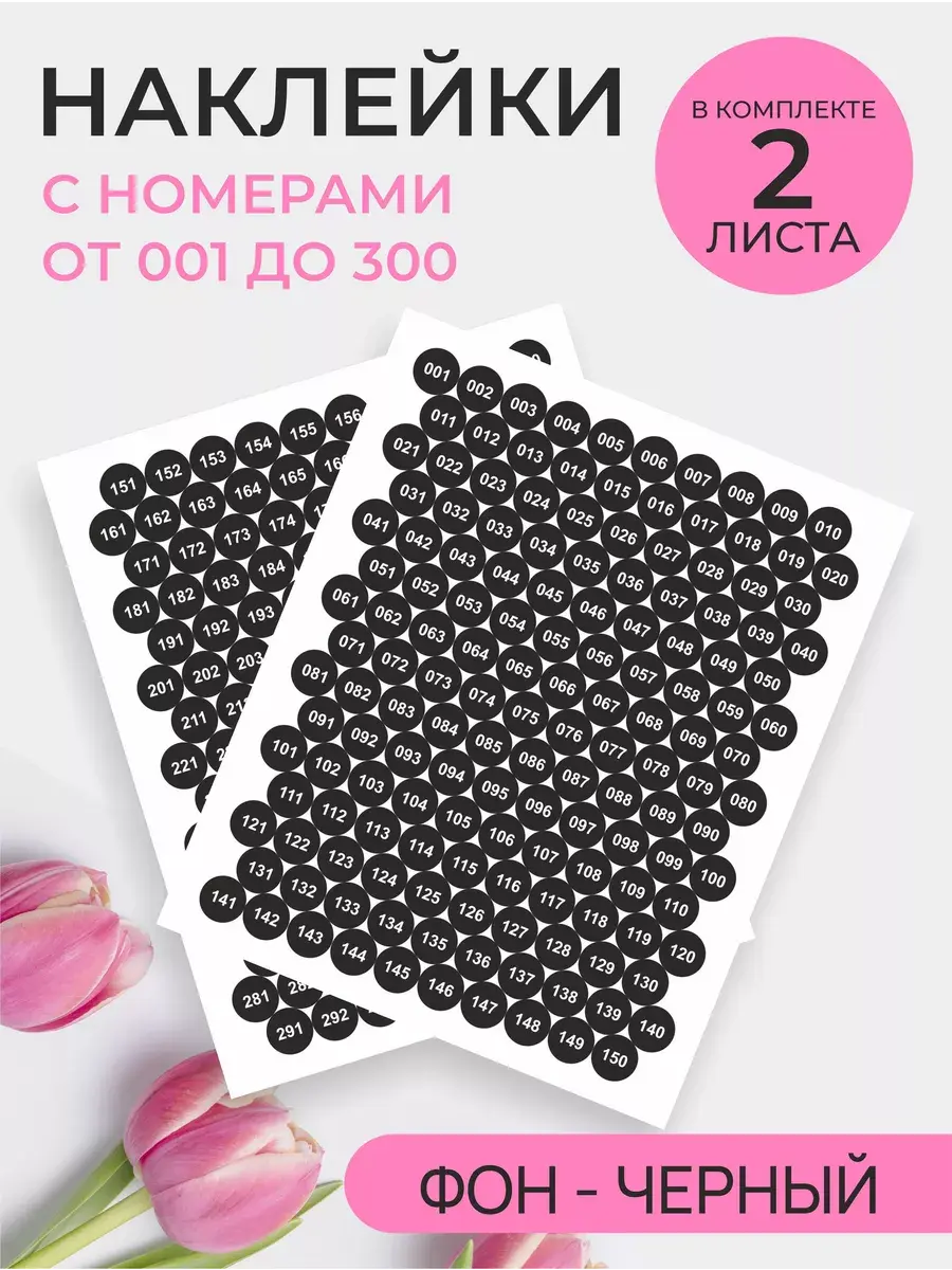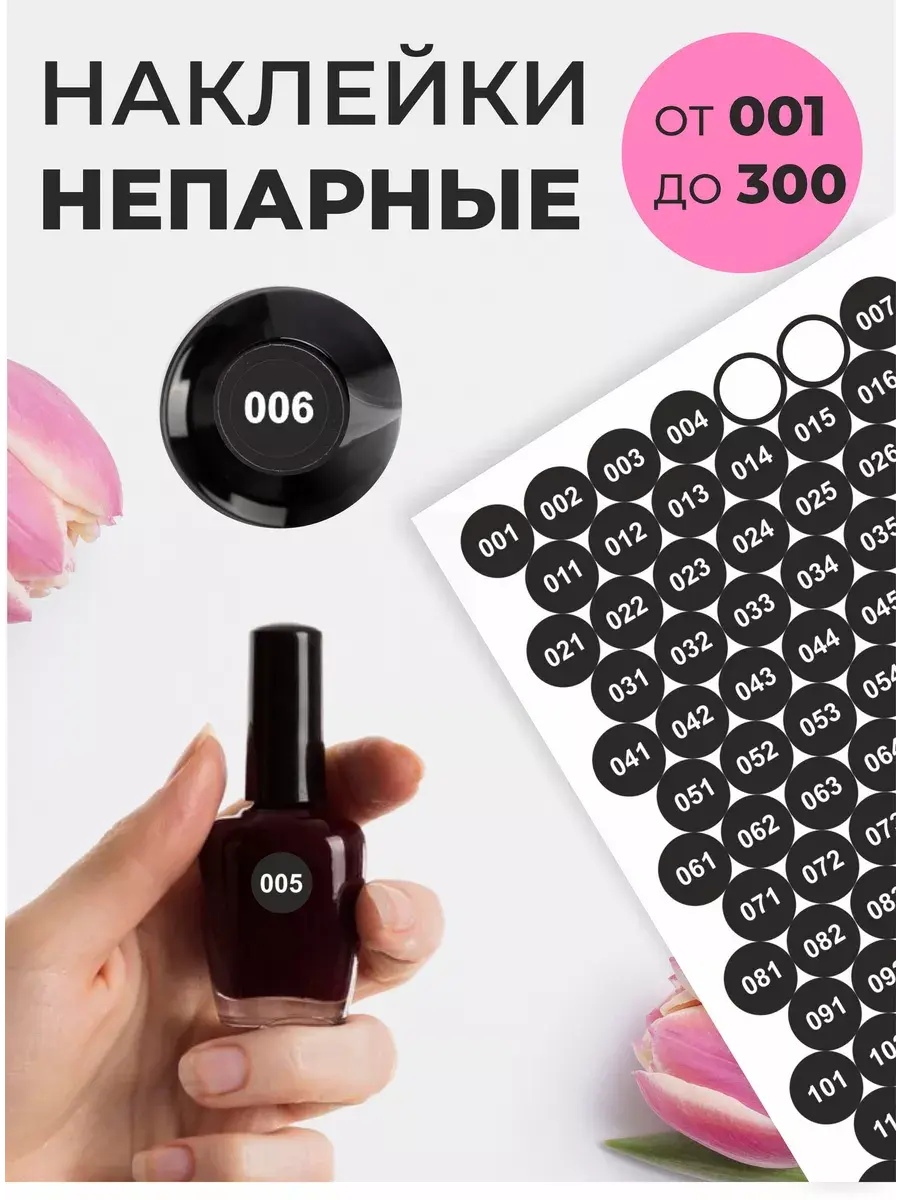 В комплекте два листа наклеек (всего 300 штук) в прочном полиэтиленовом пакете с твердой подложкой для безопасной доставки. В комплекте парные номера от 1 до 300, а типсы и баночки на фотографиях служат лишь для демонстрации продукта и не входят в набор.